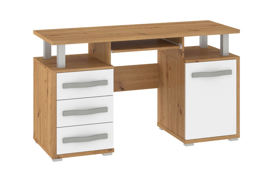 - biurko wyposażone jest w 1-drzwiowy front oraz 3 szuflady. Pod blatem znajdują się 2 praktyczne półki oraz trzecia wysuwana na klawiaturę