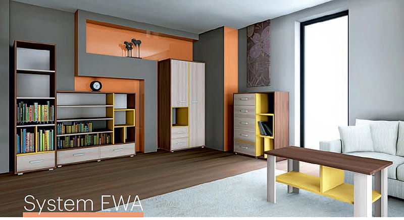 Kolekcja Ewa to piętnaście nowatorskich brył, przeznaczonych do wyposażenia pokoju młodzieżowego. Klient ma tutaj możliwość wyboru kolorystyki korpusów, frontów, a także dekoracyjnych wstawek, które dostępne są aż w ośmiu wybarwieniach. Elementy te wprowadzają do pomieszczenia sporą dawkę optymizmu, dzięki czemu każda pociecha będzie z chęcią spędzać w nim swój wolny czas. System ten charakteryzuje się geometryczną formą, która wprowadza do wnętrza ciekawy efekt wizualny.