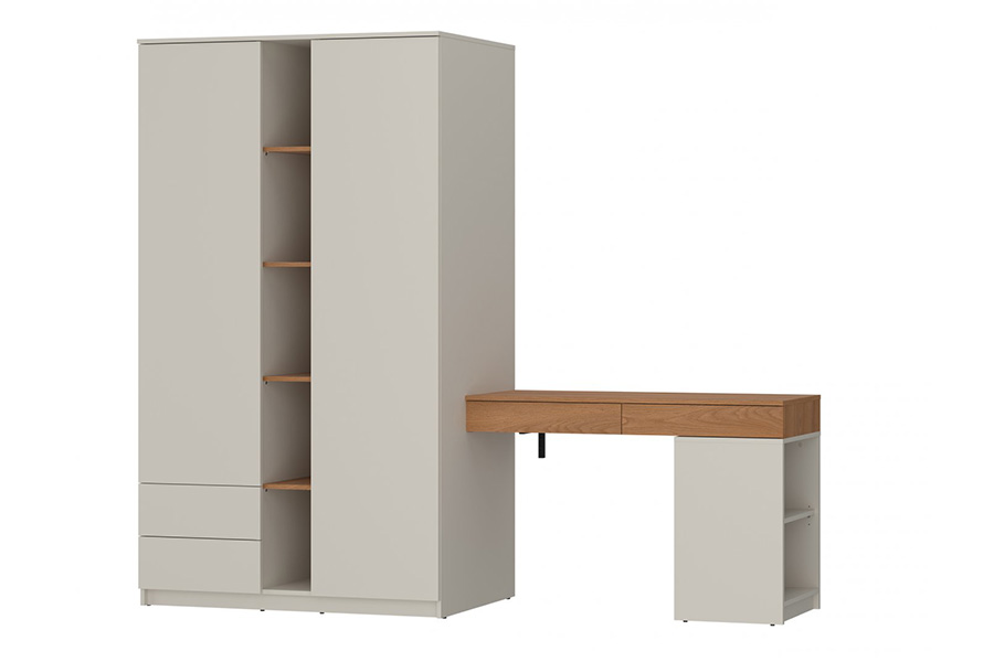 Kolekcja FANO do pokoju młodzieżowego wyróżnia się nowoczesnym minimalizmem i prostymi bryłami pozbawionymi uchwytów. Stylowe zestawienie kolorów kaszmiru z karmelowym dębem nadaje meblom uniwersalny charakter, który doskonale komponuje się z różnymi aranżacjami wnętrz. FANO harmonijnie łączy funkcjonalność z estetyką, oferując nowoczesne rozwiązania dekoracyjne, które są zarówno praktyczne, jak i eleganckie.