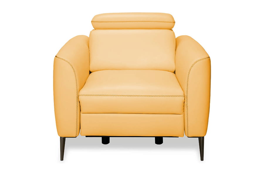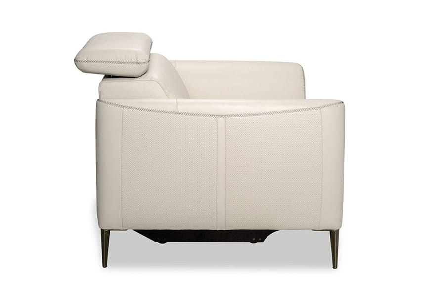 Do produkcji fotela wykorzystano naturalną skórę licową (S1 29), która jest miękka, naturalnie elastyczna i wytrzymała. Zachowuje piękną, wyraźną fakturę i naturalny rysunek. Dodatkowo wykonano precyzyjne przeszycia kontrastową nicią, która podkreśla niebanalny design mebla w kształcie litery "X" oraz perforacje skóry na boku.