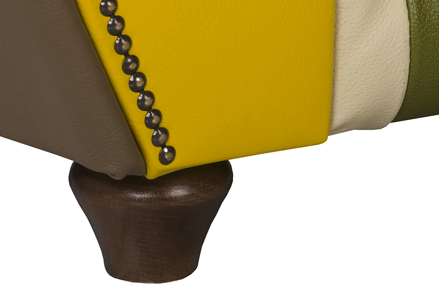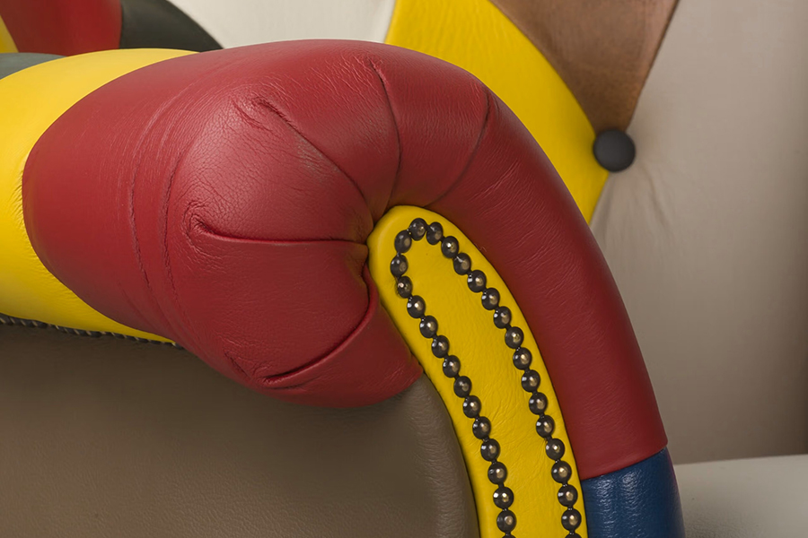 Patchwork Londyn to odważna interpretacja klasyki chesterfield: głębokie, ręczne pikowanie, rolowane podłokietniki i dekoracyjne pinezki spotykają się tu z wyrazistą, wielobarwną kompozycją skóry. Na drewnianym stelażu z buku i brzozy, z drewnianymi nóżkami i tapicerką z naturalnej skóry — fotel, który natychmiast staje się centralnym punktem wnętrza.