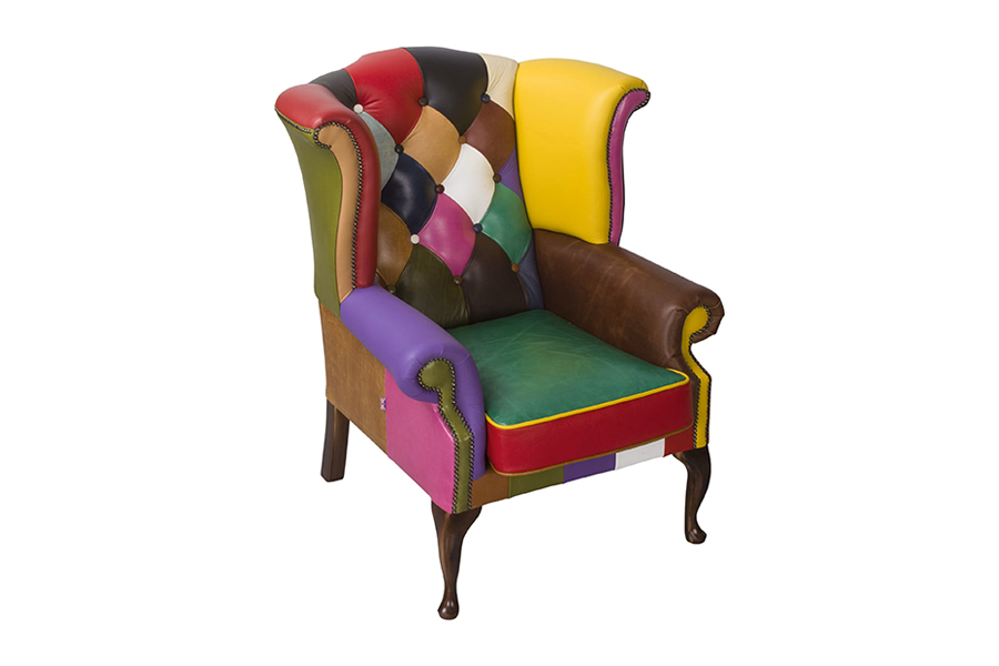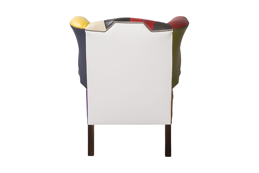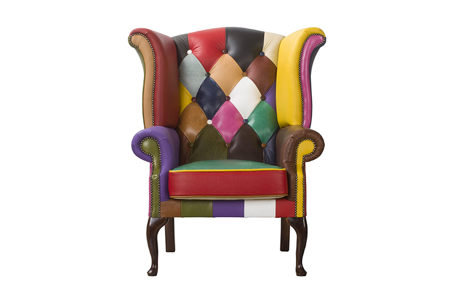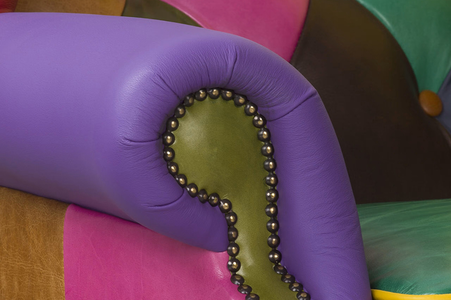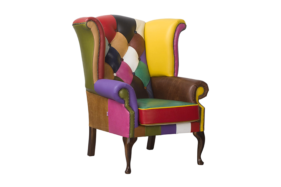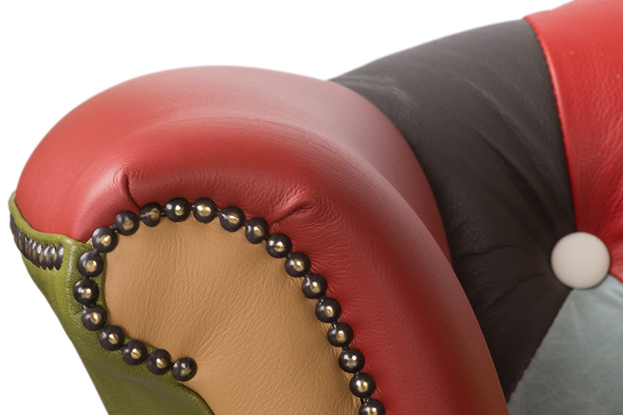 Patchwork Queen to wyjątkowy fotel w stylu chesterfield, który łączy klasyczną formę z odważnym, kolorowym wykończeniem. Charakterystyczne pikowanie, ozdobne pinezki i wysokie oparcie w połączeniu z patchworkową tapicerką ze skóry naturalnej sprawiają, że staje się on centralnym punktem każdej aranżacji.