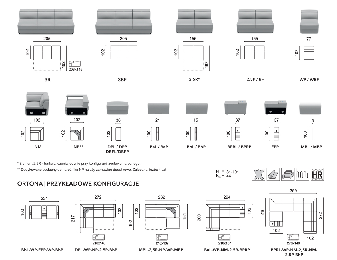 Komfortowy system modułowy ORTONA zapewniający doskonałe rozwiązanie pasujące do każdego wnętrza. Mocne strony kolekcji: uniwersalność w kreowaniu zestawu o różnych kształtach i rozmiarach, głębokie wygodne siedziska, duża i wygodna powierzchnia do leżenia typu „lift-puma”, zestaw zasilający dla urządzeń elektronicznych, pojemniki na pościel, ruchome wielostopniowe zagłówki. Ergonomia dzięki modułowości: różnorodność dostawek, elementów narożnych i boków pozwala na kreowanie oryginalnych układów oraz rozmiarów mebla dostosowanych do własnej fantazji i możliwości. Ruchome zagłówki pozwalają na wybranie ulubionej pozycji. Nowoczesny mechanizm funkcji do leżenia typu „lift” zajmuje niewiele miejsca, wymaga minimum wysiłku przy rozkładaniu; otrzymuje się pokaźną powierzchnię do leżenia, o zaskakującym komforcie: na całej powierzchni siedzisk i w funkcji do leżenia zastosowano odpowiednią kombinację sprężyn, pianki HR i pianki typu „memory” oraz wypełnień włókniną puszystą. Elementy BPRL / BPRP / EPR wyposażone są w gniazdo USB 5V i ładowarkę indukcyjną (do przystosowanych modeli smartfonów); trzy rodzaje boków do wyboru wzbogacają możliwości stylistyczne zestawów. Do wyboru szeroka gama tkanin obiciowych w niezliczonej ilości kolorów i faktur. Dla osób preferujących obicia skórzane oferujemy wyłącznie naturalne skóry licowe.