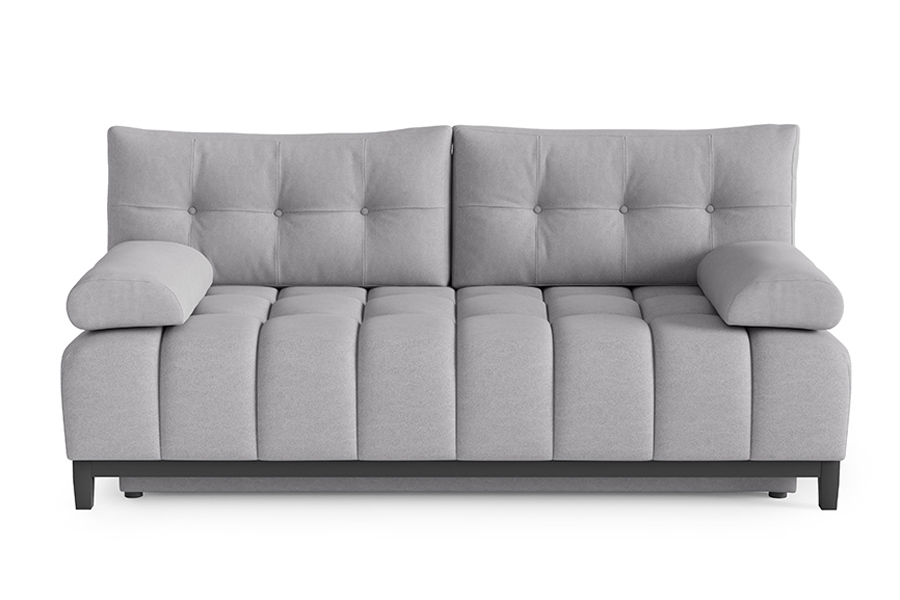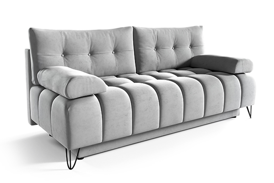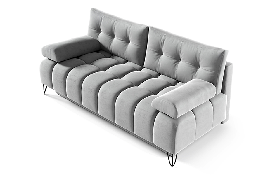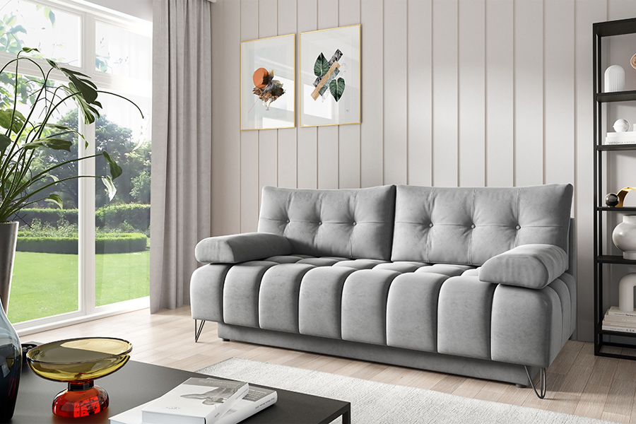 Kanapa Broadway to połączenie niezwykłej funkcjonalności z charakterystycznym stylem nowoczesnym. Mebel o oszczędnym wymiarze, który doskonale wkomponuje się w niewielkie przestrzenie. Jej kompaktowe rozmiary doskonale sprawdzą się zarówno w mieszkania jak i pokojach gościnnych, oferując przy tym wygodę na najwyższym poziomie. System rozkładania DL pozwala na szybką i łatwą transformację kanapy w wygodne łóżko, idealne dla gości. Pikowane guzikami poduszki oraz unikalny wzór siedziska nadają meblowi elegancji i nowoczesnego wyrazu. Dodatkowy pojemnik na pościel zapewnia praktyczne przechowywanie, dwa podłokietniki komfort, natomiast metalowe industrialne nogi dodają mu charakteru i stabilności.