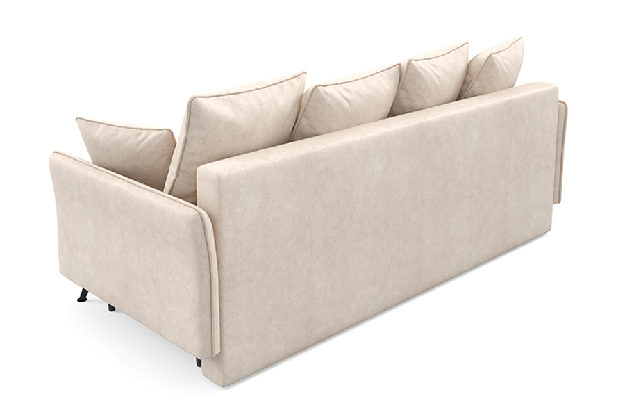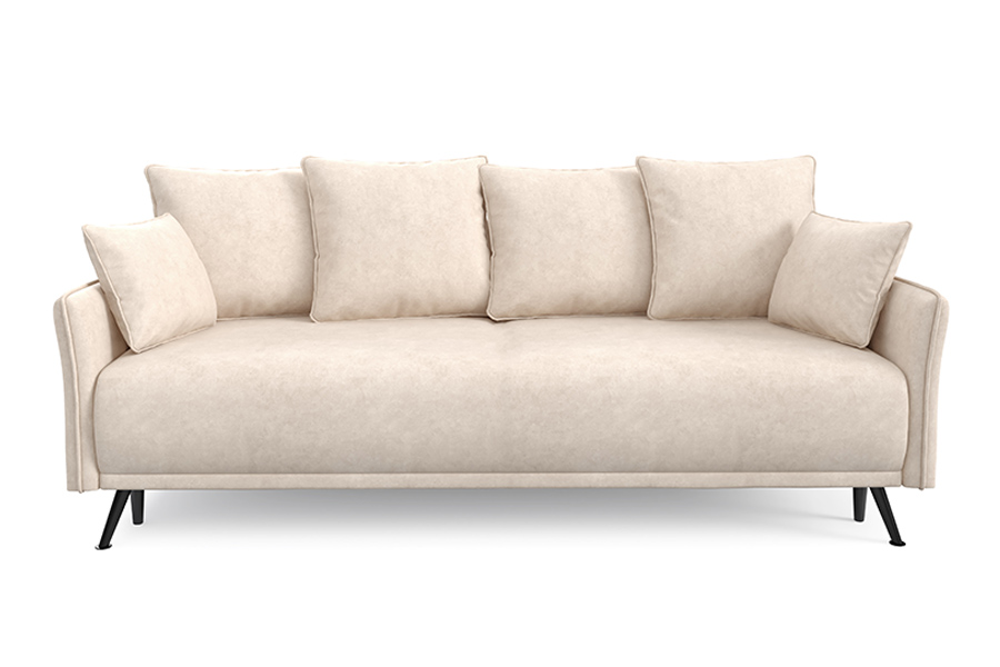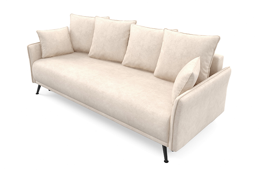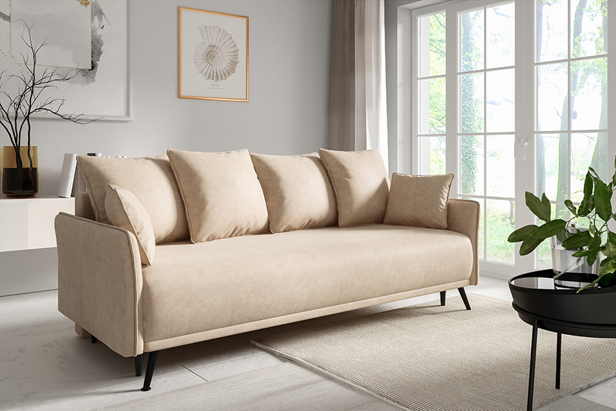 Kanapa Lazio to elegancki i funkcjonalny mebel idealny do nowoczesnych wnętrz. Dzięki systemowi rozkładania DL, łatwo przekształca się w wygodne łóżko, a pojemnik na pościel oferuje praktyczne miejsce do przechowywania. Wyposażona w cztery duże poduszki z ozdobną lamówką oraz dwie mniejsze poduszki, zapewnia wyjątkowy komfort. Boczki z lamówką i industrialne nogi podkreślają jej nowoczesny styl.