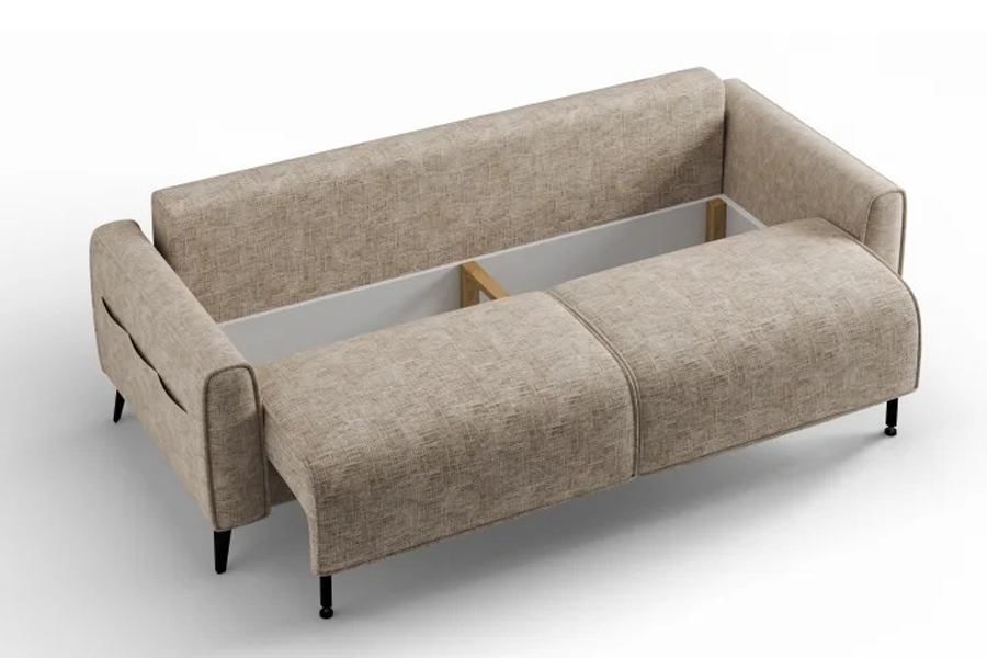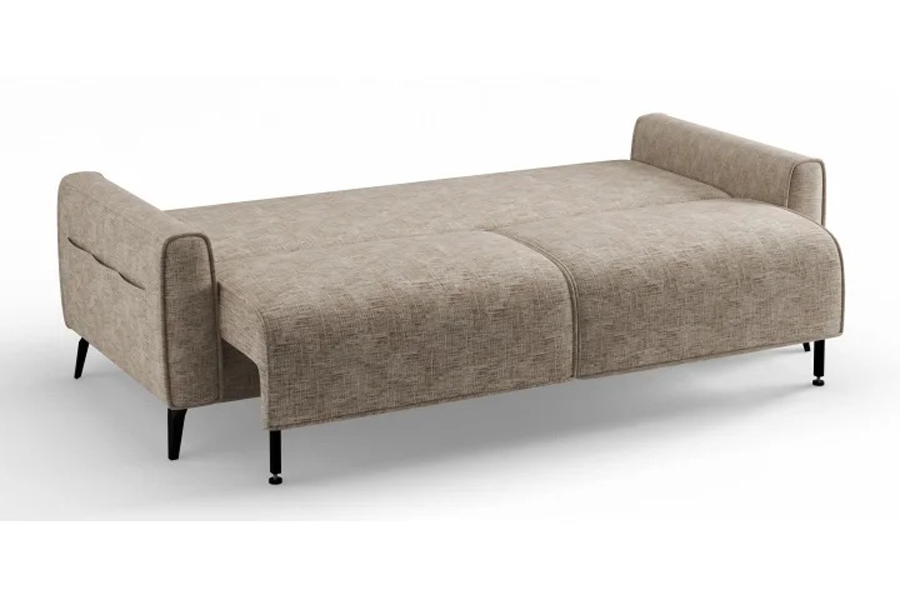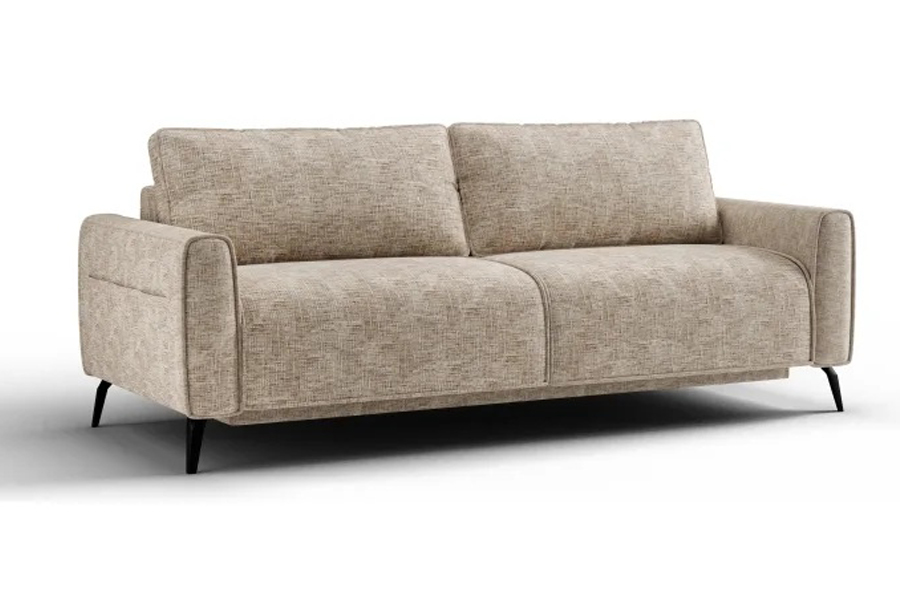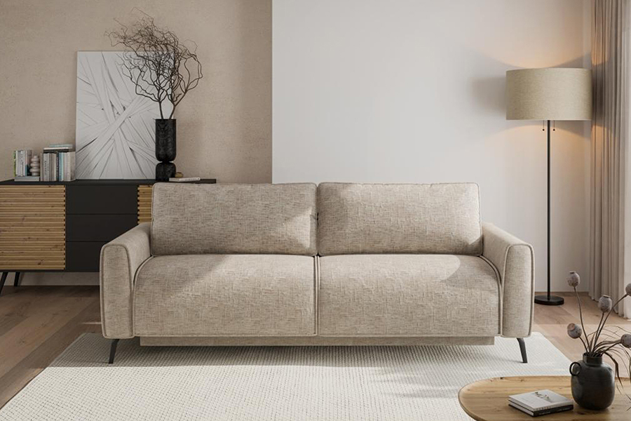 Kanapa Global to mebel wypoczynkowy który łączy dopracowaną formę z komfortem codziennego wypoczynku. Jej proporcje – szerokość 237 cm, głębokość 105 cm oraz wysokość 94 cm – sprawiają, że sprawdzi się zarówno w przestronnych salonach, jak i bardziej kameralnych wnętrzach. Całość spoczywa na czarnych, metalowych nóżkach, których wysokość pozwala na swobodny dostęp do podłoża, co ułatwia utrzymanie czystości. Siedzisko tapicerowane wypełnione sprężyną bonell oraz pianką wysokoelastyczną zapewnia wygodę zarówno podczas codziennego relaksu, jak i w trakcie dłuższego użytkowania. Oparcie z pianki wysokoelastycznej zostało zaprojektowane tak, by zapewnić odpowiednie podparcie, a całość uzupełniają geometryczne przeszycia, które tworzą subtelną strukturę, przyciągając wzrok i nadając kanapie bardziej wyrazistego charakteru. Ten element wizualny nadaje całości ponadczasowy wyraz. Mebel wyposażono w mechanizm rozkładania typu DL, który umożliwia szybkie i płynne przekształcenie kanapy w powierzchnię spania o wymiarach 200x150 cm. Wystarczy wysunąć siedzisko do przodu i złożyć oparcie, aby uzyskać jednolitą i równą przestrzeń do wypoczynku nocnego. Dodatkowym atutem jest ukryty pojemnik na pościel, który nie wpływa na estetykę bryły i pozostaje niewidoczny w codziennym użytkowaniu.