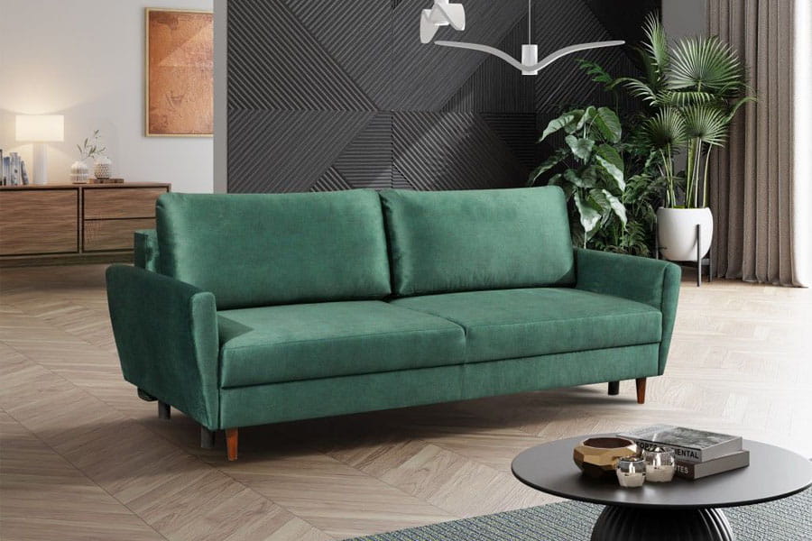 Kanapa 3-osobowa z funkcją spania i pojemnikiem na pościel. Posiada wkład sprężynowy typu faliste oraz piankę wysokoelastyczną HR. Elementy ozdobne w kolorze drewna. Nowoczesny mechanizm umożliwia rozłożenie mebla do pozycji spania poprzez lekkie uniesienie siedziska do góry i przesunięcia do przodu.