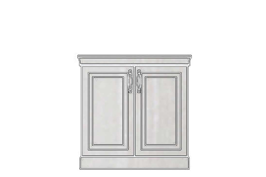 - Korpus - płyta meblowa laminowana; fronty - płyta MDF tłoczona, wykończona folią PCV; krawędzie blatów i frezowania frontów wykończone lakierem; metalowe uchwyty, szkło