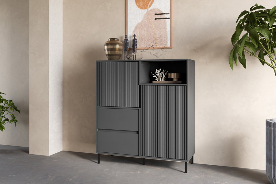 - Nowoczesna komoda AVENALE AVEK03 to propozycja dla osób poszukujących niebanalnego designu i funkcjonalności w jednym. Wykończona w dekorze antracyt supermat, przyciąga wzrok minimalistyczną formą i dekoracyjnym ryflowaniem frontów. Smukła bryła oparta na czarnych, metalowych nóżkach nadaje meblowi lekkości, a staranne wykończenie podkreśla elegancki charakter całej kolekcji. Nóżki nie tylko podkreślają nowoczesny charakter mebla, ale również umożliwiają swobodne poruszanie się robota sprzątającego pod jego konstrukcją (wysokość dla robota sprzątającego-12 cm). To praktyczne rozwiązanie, które ułatwia utrzymanie porządku bez przesuwania mebla. Komoda z powodzeniem wpisuje się zarówno w aranżacje nowoczesne, jak i loftowe czy industrialne. Dzięki kompaktowym wymiarom (105,4 cm szerokości i 117,2 cm wysokości) idealnie sprawdzi się w mniejszych przestrzeniach – od salonu, przez sypialnię, po gabinet czy pokój młodzieżowy.