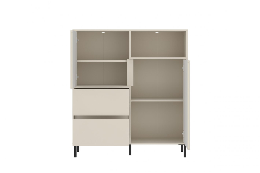 - Wnętrze mebla zostało zaprojektowane z myślą o efektywnym przechowywaniu. Komoda wyposażona jest w dwie szuflady osadzone na prowadnicach kulkowych z pełnym wysuwem – pozwalają one na wygodne i bezpieczne przechowywanie podręcznych przedmiotów. Dwa fronty uchylne z funkcją cichego domykania skrywają pojemne przestrzenie z półkami, idealne na większe elementy garderoby, dokumenty, a także tekstylia. Dodatkowa wnęka bez frontu umożliwia wyeksponowanie dekoracji, książek lub sprzętu codziennego użytku. Całość wykonana została z trwałych materiałów – płyty wiórowej laminowanej oraz płyty MDF – co przekłada się na solidność konstrukcji oraz łatwość w czyszczeniu.