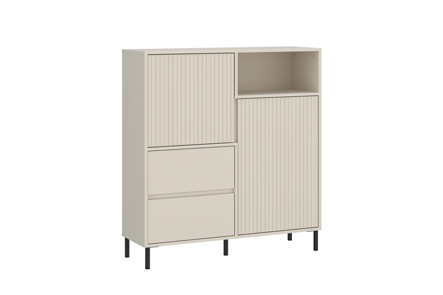 - Komoda AVENALE AVEK03 2D2S w dekorze cashmere to nowoczesna propozycja dla osób, które cenią stonowaną elegancję, wygodę użytkowania i uniwersalny styl. Subtelne ryflowania na frontach, jednolita kolorystyka oraz zintegrowane wybrania na froncie zamiast tradycyjnych uchwytów nadają komodzie nowoczesny charakter. Komoda opiera się na czarnych, metalowych nóżkach, które nie tylko podkreślają jej lekkość wizualną, ale również podnoszą funkcjonalność dzięki czemu bez problemu pod meblem porusza się robot sprzątający( wysokość dla robota sprzątającego-12 cm). Kompaktowy wymiar – 105,4 cm szerokości, 117,2 cm wysokości i 40 cm głębokości – czyni z niej idealne rozwiązanie do wnętrz o ograniczonej przestrzeni: od salonu, przez przedpokój, po pokój nastolatka czy sypialnię.