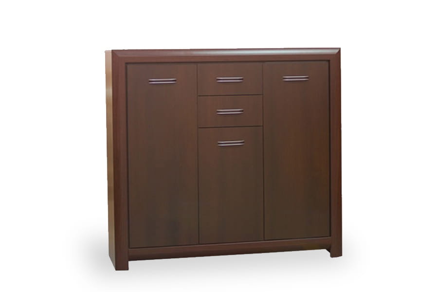 - komoda posiada trzydrzwiowy front z dwiema górnymi szufladami, pozwalającymi na uporządkowane przechowywanie w jej wnętrzu wielu przedmiotów