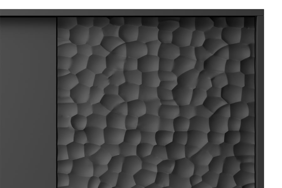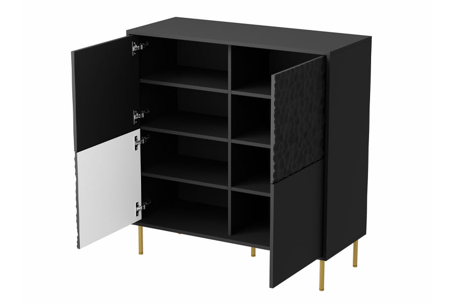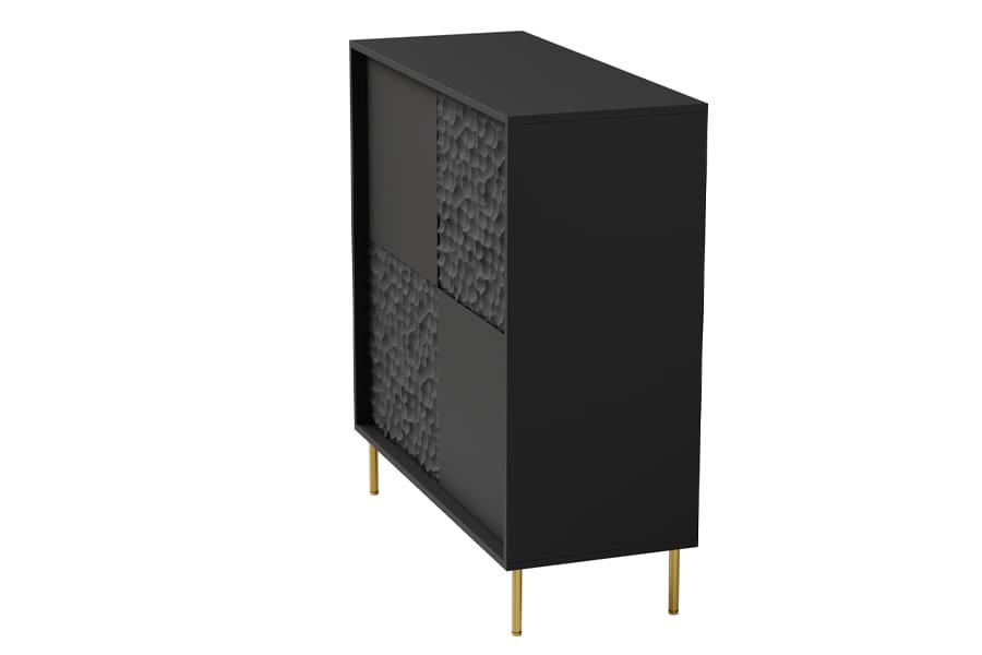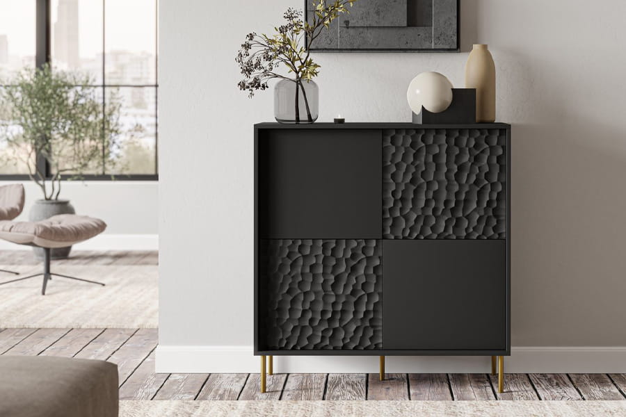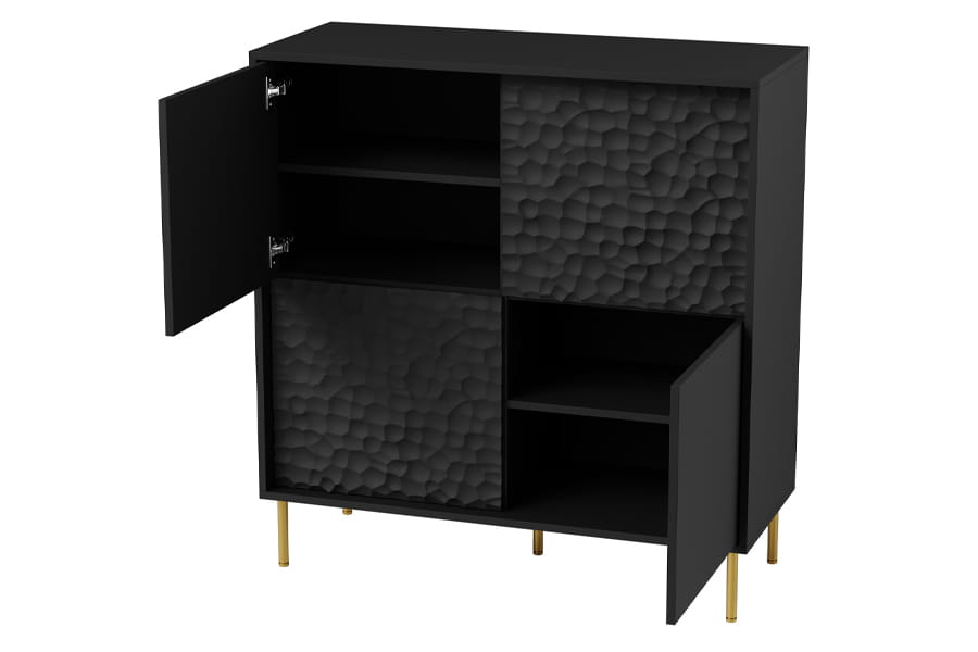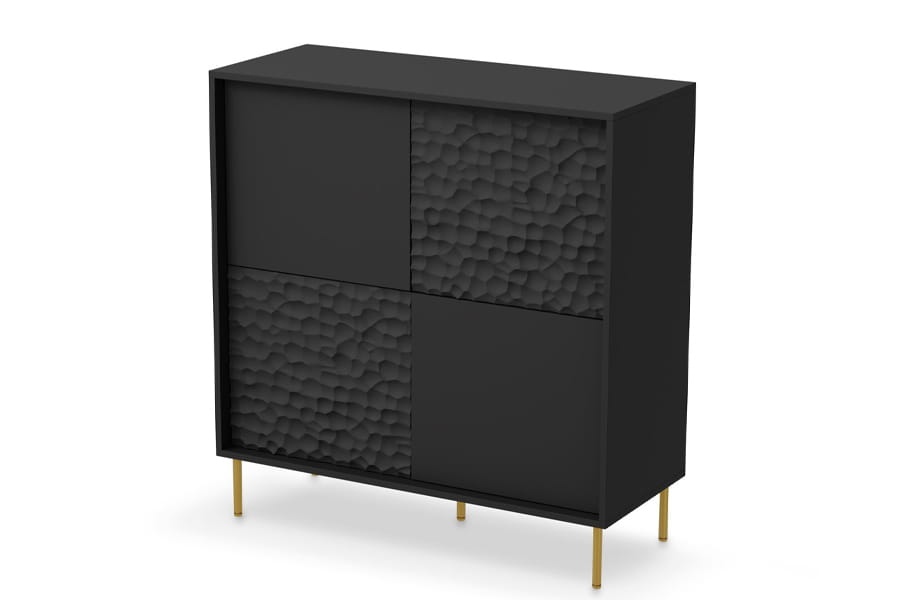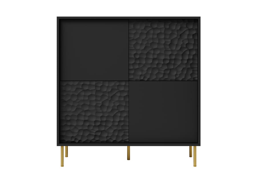 Kolekcja Bullet to bardzo elegancki i stylowy sposób na odświeżenie wnętrza. Meble są wykonane z płyty meblowej, w kolorze czarnym, z dekorem 3D w formie wgłębień na frontach. Złoty detal w postaci cienkich nóżek sprawia, ze całość wygląda bardzo elegencko i luksusowo. Dodatkowo meble w kolorze czarnym doskonale dopasują się do różnych stylów wnętrzarskich, od nowoczesnego po klasyczny. Komoda Bullet, 4-drzwiowa, dzięki swojej pojemnej konstrukcji, zapewni Ci wiele miejsca do przechowywania różnych przedmiotów. To doskonałe rozwiązanie dla tych, którzy lubią mieć wszystko poukładane i zorganizowane. Czarny kolor mebla z pewnością wprowadzi do Twojego wnętrza elegancki i nowoczesny styl, który idealnie wpasuje się w każde pomieszczenie. Ciekawa, kwadratowa forma komody sprawi, że mebel odnajdzie się w różnych wnętrzach Twojego domu.