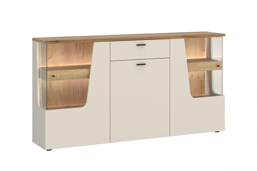 W kolekcji Cut Out matowy kaszmir gra pierwsze skrzypce, ale to jego połączenie z ciepłym dekorem Dąb Coast Evoke oraz przeszkleniami w bokach witryn i komód nadaje meblom wyjątkowego charakteru. Dodatkowe oświetlenie LED (w zestawie) efektownie podkreśla zawartość mebli, tworząc przytulną atmosferę sprzyjającą wspólnym chwilom.