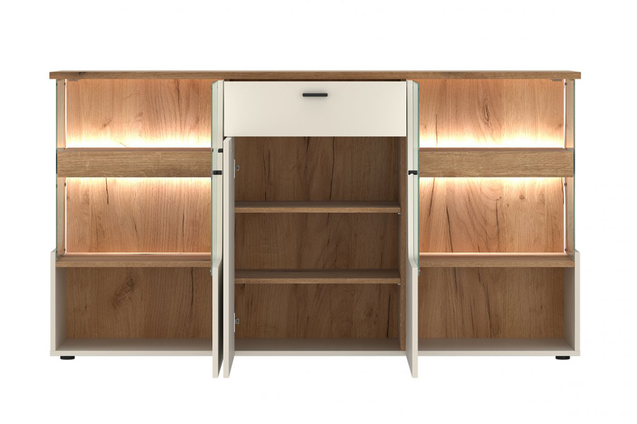 Model wyposażono w trzy uchylne drzwi z systemem cichego domykania oraz praktyczną szufladę, również z funkcją soft-close, idealną do przechowywania drobnych akcesoriów. Wnętrze komody oferuje przestronne półki, które ułatwiają organizację domowych przedmiotów. - Czarne, matowe uchwyty oraz subtelne stopki w tym samym kolorze podkreślają nowoczesny charakter komody i stanowią efektowny kontrast dla jasnych frontów. Dodatkowym atutem jest oświetlenie LED GAMA (2 punkty), emitujące neutralną białą barwę, które podkreśla walory estetyczne mebla oraz tworzy przytulny klimat w pomieszczeniu.