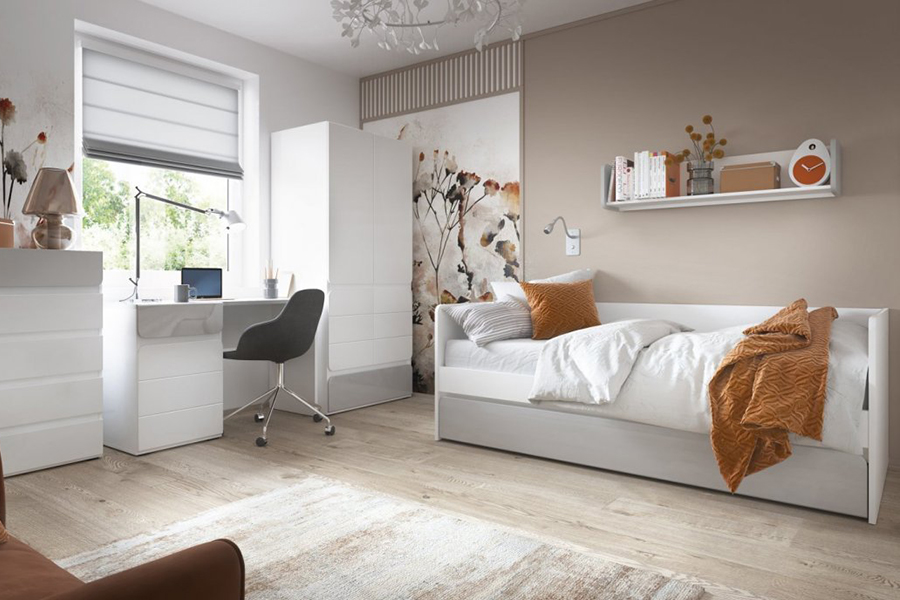Flexi to młodzieżowy zestaw mebli o wszechstronnym designie, który równie dobrze sprawdzi się w pokoju dziecięcym. Subtelne kontrasty dekorów oraz poziome frezowania na frontach tworzą oryginalne kompozycje, podkreślając estetyczny charakter mebli. Dodatkowym atutem są zaokrąglone fronty i korpusy, które nadają kolekcji lekkości oraz zapewniają komfort użytkowania. Program Flexi, pozbawiony uchwytów, podkreśla swoją nowoczesność i praktyczność, oferując funkcjonalne rozwiązania w stylowym wydaniu.