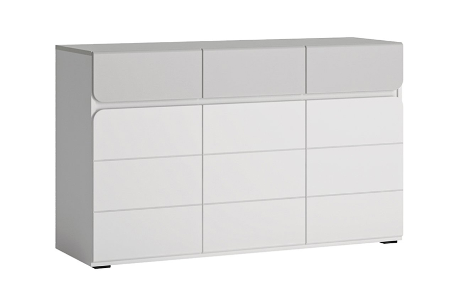 - Komoda z kolekcji Flexi jest duża i pakowna. Delikatnie kontrastujący blat i szuflady oraz poziome frezowania na frontach to ciekawy efekt wizualny, podkreślający walory estetyczne mebla.