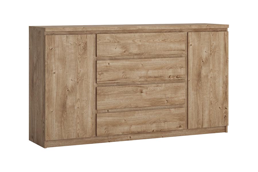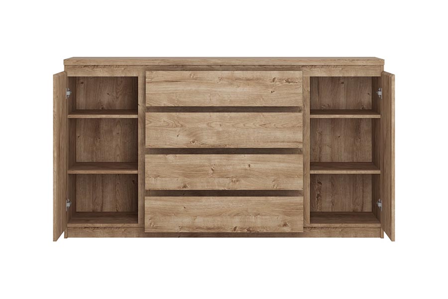 Komoda z kolekcji Fribo to powrót do natury w klimatycznym wydaniu. Proste, uniwersalne wzornictwo sprawdzi się w niemal każdym pomieszczeniu. A cztery pojemne szuflady oraz półki w części zamkniętej spełnią oczekiwania co do przechowywania każdego domownika. Blat o długości 165,4 cm może pełnić funkcję dodatkowego miejsca do przechowywania pamiątek rodzinnych lub ulubionych dodatków. Gładkie fronty w kolorze drewna z nowoczesnym systemem bezuchwytowym i szuflady z pełnym wysuwem sprawiają, że komodę użytkuje się komfortowo i bezpiecznie. Komoda występuje w dwóch odcieniach kolorystycznych - Dąb Ribbeck Złoty i Biel Alpejska, a więc każdy znajdzie coś dla siebie. Mebel wykonany jest z płyty wiórowej laminowanej odpornej na wilgoć, zarysowania, uszkodzenia i wysoką temperaturę.