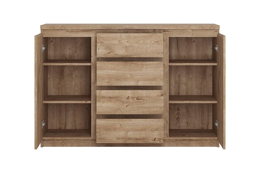FRIK03 to kolejna propozycja komody z kolekcji Fribo od Meble Wójcik. Geometryczna forma oraz ponadczasowy dekor w ciepłym odcieniu Dąb Ribbeck Złoty dodaje kolekcji ponadczasowego stylu, oraz duże możliwości aranżacyjne - zmieniając dodatki, zmieniasz klimat wnętrza. Wnętrze komody kryje najbardziej popularny układ - cztery pojemne szuflady wyposażone w system pełnego wysuwu oraz półki w przestrzeni zamkniętej. Komoda wyposażona jest w niezwykle praktyczny i komfortowy system bezuchwytowy. d.Mebel wykonany jest z płyty wiórowej laminowanej odpornej na wilgoć, zarysowania, uszkodzenia i wysoką temperaturę. Komoda występuje w dwóch wybarwieniach - Biel Alpejska i Dąb Ribbeck Złoty.