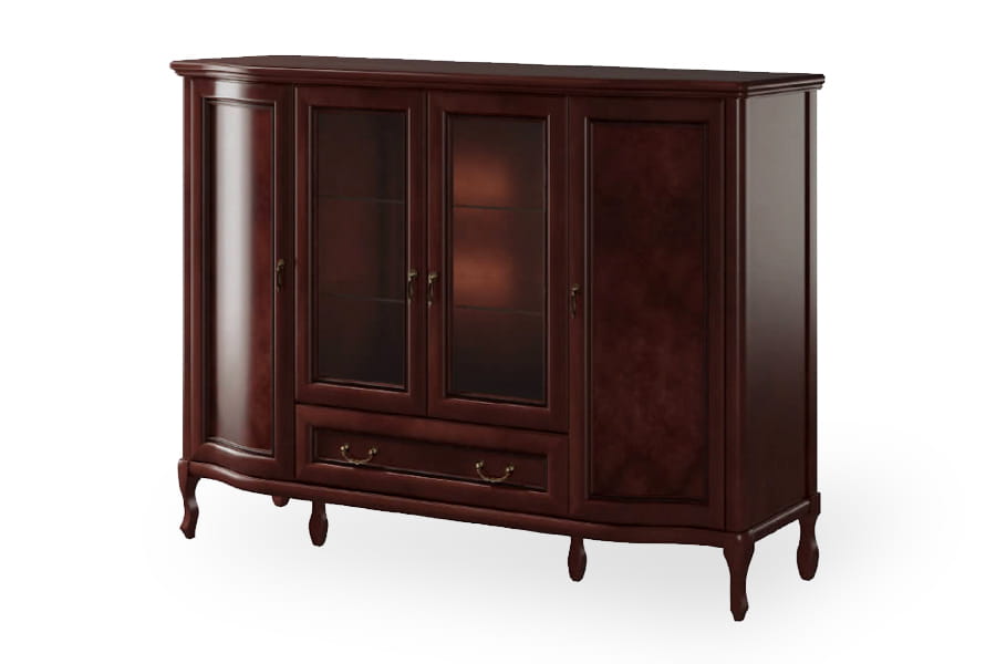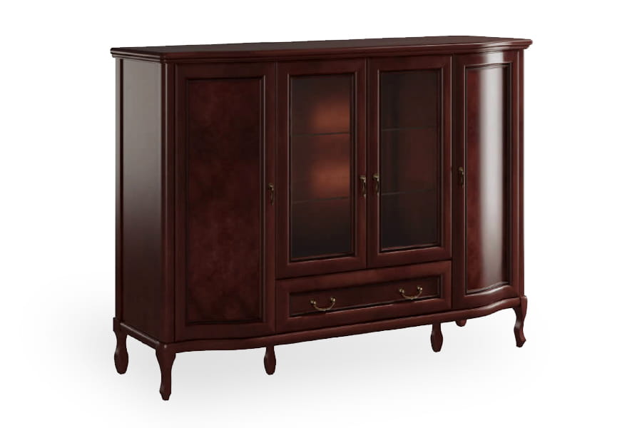 Komoda Gerard 4D-1SZ producenta Latzke świetnie wkomponuje się w przestronne i elegancko umeblowane wnętrze. Stylizowane komody, wiele wariantów toaletek, ciekawe stoliki, efektowne stoły oraz szafki nocne tuż pod ręką – jakie inne wymagania mają spełniać wymarzone meble do Twojego domu? Komoda spodoba się tym, którzy szukają mebli eleganckich a przy tym niezwykle solidnych. Cechą dominującą w tym produkcie są wysokie, gięte nóżki typowe dla klasycznego designu ramkowe fronty oraz pięknie wykończone uchwyty. Ten gustowny mebel wyposażony w praktyczne szafki, szuflady oraz mini witrynę posłuży nie tylko do przechowywania drobnych rzeczy, ale również do podkreślenia za przeszklonym frontem dekoracji i wartych wyróżnienia przedmiotów. Możesz je dodatkowo wyeksponować za pomocą delikatnego oświetlenia (do kupienia oddzielnie). Mebel starannie wykonano z kilku niezwykle trwałych materiałów. Domyślny kolor dla tego produktu to orzech antyczny.