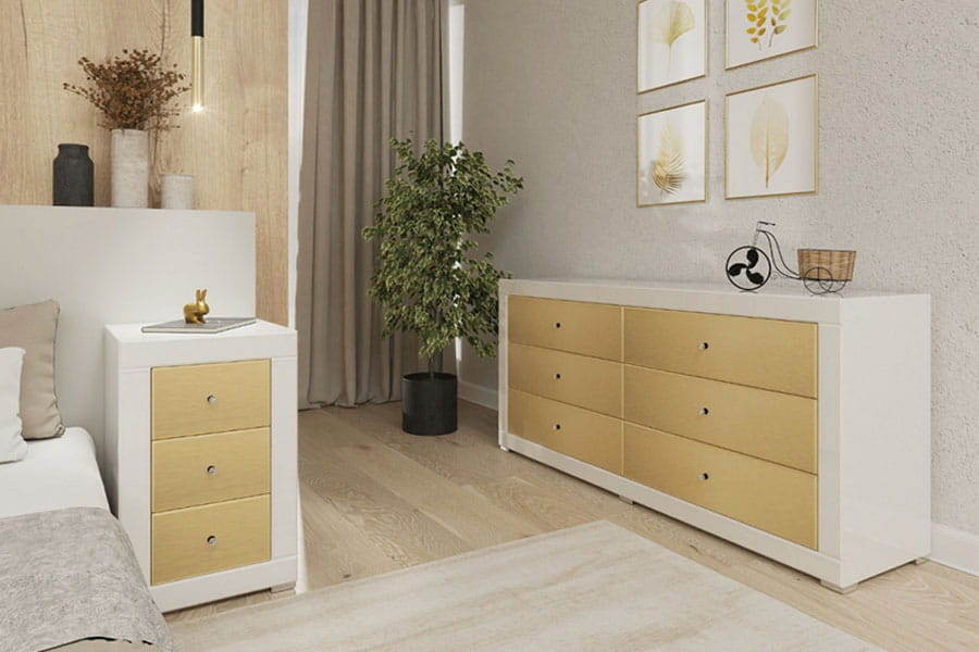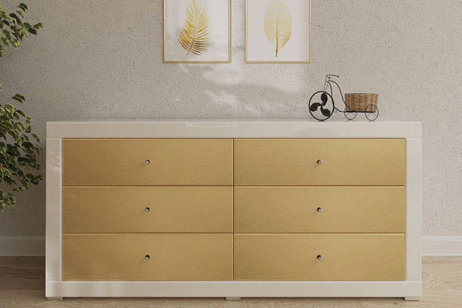 Lustrzana komoda z białego fazowanego szkła i z frontami w błyszczącym złotym kolorze. To jedyna taka kolekcja mebli w Europie, kupując ją, masz więc pewność, ze otrzymasz niepowtarzalny i ręcznie robiony mebel. To także produkt rzemieślniczy, który od początku do końca powstaje w Polsce. Komodę zrobiliśmy ze szkła wysokiej jakości. Fronty wykonaliśmy z wysokiej jakości płyty w złotym odcieniu na wysoki połysk. To płyta z kolekcji firmy kronospan AL04 Brushed Gold. Komoda ma też 6 pojemnych i pakownych szuflad, jest więc meblem bardzo praktycznym, z dużą ilością miejsca do przechowywanie. W szufladach zamontowaliśmy niezawodne prowadnice Axis Pro z funkcją miękkiego domyku. Dzięki nim komoda otwiera się i zamyka lekko i bezproblemowo. Nasza komoda jest elegancka i subtelna, a przy tym bardzo dekoracyjna. Świetnie się sprawdzi we wnętrzach w stylu glamour czy nowoczesnych. Możesz ją wybrać w dowolnej szerokości od 100 do 170 cm. Jest też głęboka na 40 cm i wysoka na 74 cm.