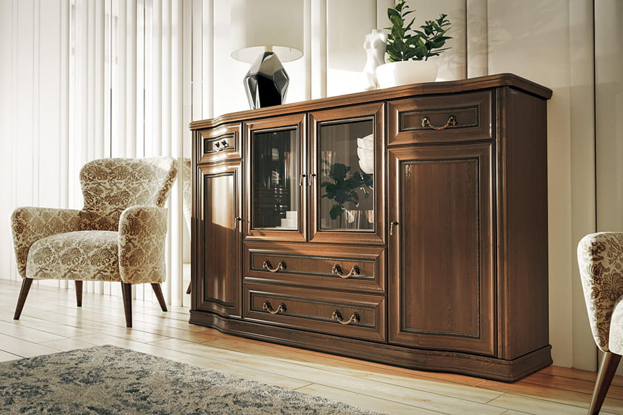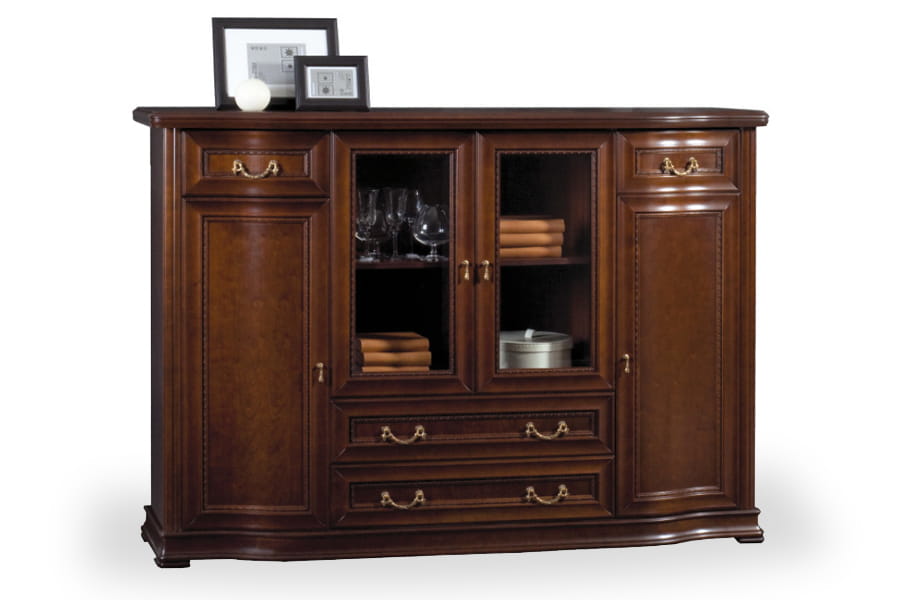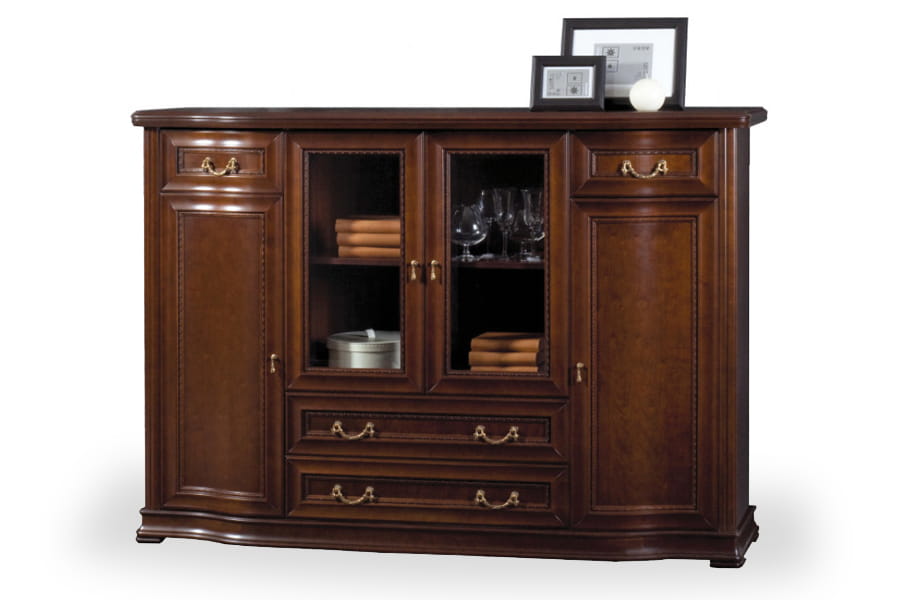- komoda z 2-szafkami z oszkloną witryną w środkowej części oraz z 4-szufladami