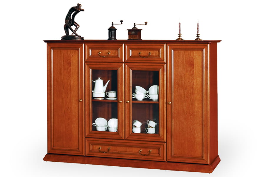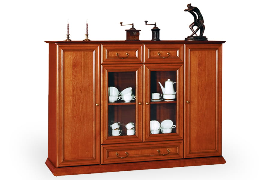 Komoda Jurgen 4D-W ( wysoka ) producenta Latzke świetnie wkomponuje się w przestronne i elegancko umeblowane wnętrze. Komoda spodoba się tym, którzy szukają mebli eleganckich a przy tym niezwykle solidnych. Cechą dominującą w tym produkcie są typowe dla klasycznego designu ramkowe fronty oraz pięknie wykończone uchwyty. W komodzie znajdują się trzy szuflady, dwie szafki a za oszkloną częścią znajdziesz miejsce na efektowne dekoracje, które będą wspaniale prezentować się na tle wewnętrznego oświetlenia, dostępnego za dodatkową opłatą. Mebel starannie wykonano z kilku niezwykle trwałych materiałów. Domyślny kolor dla tego produktu to czereśnia złocista.