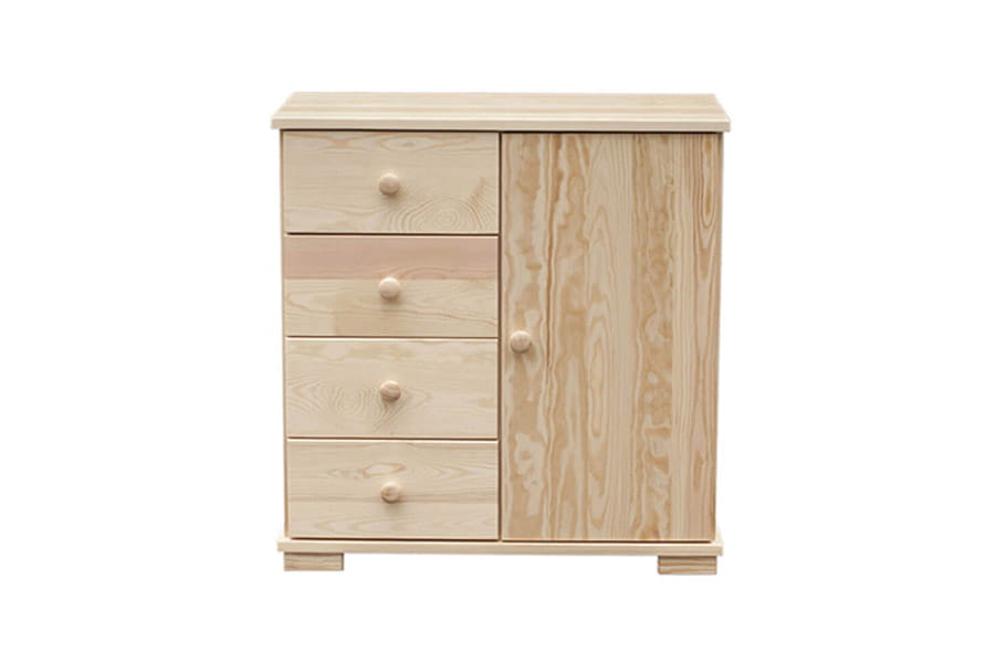 KOMODA KACPER 3 wykonana z litego drewna sosnowego może być dopasowana niemal w każdym wnętrzu. Cztery szuflady pomieszczą wiele przydatnych rzeczy. Za drzwiczkami półki, na których można przechowywać, np. książki, płyty, odzież i inne akcesoria. KOMODA KACPER 3 to nowoczesny mebel, a prosty wygląd i możliwość doboru koloru sprawiają, że ma uniwersalny charakter – pasuje do pomieszczeń w różnych stylach.
