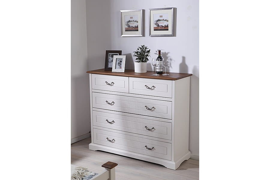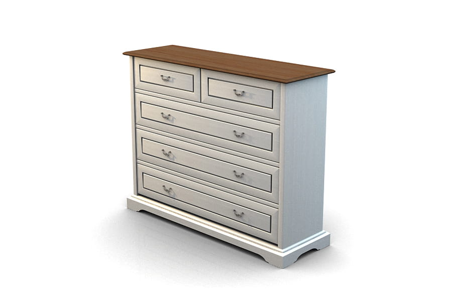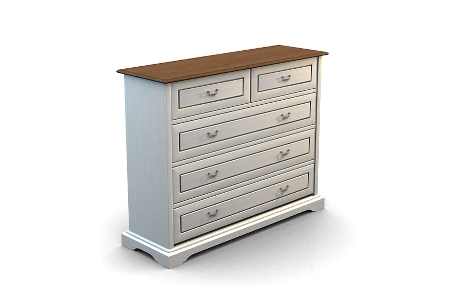 Kolekcja Olivera wykonana jest z wysokiej jakości materiału (drewno dębowe),pomalowana ekologiczną farbą niemieckiej firmy Plantag. W szafach i komodach szuflady montowane są na renomowanych prowadnicach austriackiej firmy Blum posiadających wieczystą gwarancję. Meble nadają niezwykle ciepły klimat, a przez swój uniwersalny wygląd i funkcjonalność mogą służyć przez wiele lat. Elementami wykonanymi z litego drewna w meblach z kolekcji Olivera są: korony, ramki frontów, cokoły, listy ozdobne montowane na boku mebla, jak i między szufladami, nogi w stołach oraz łóżkach, ramy szczytów łóżek i zdobienia nóg. Wszystkie blaty brył mebli posiadają na brzegach doklejone listwy z litego dębu. Natomiast korpusy mebla, jak i półki wykonane są z płyty wiórowej okleinowane dębową okleiną. Płyciny, jak i czoła szuflad wykonane są z wysokiej jakości płyt MDF okleinowanych naturalnym fornirem, a tylne ściany wykonane są z białej płyty HDF. Wybarwienie mebli Olivera to połączenie rustykalnego brązu i bieli. Dodatkowo elementy rustykalne pokryte są bejcą. W meblach zamontowane są prowadnice dolnego montażu z częściowym wysuwem wyposażone w system cichego domyku. Dodatkowo w drzwiach montowane są zamki na klucze z chwostami i uchwyty firmy SIRO, które dopełniają piękny wygląd mebla.
