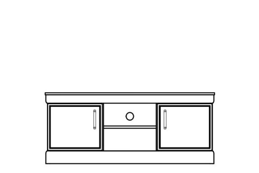 - Komoda RTV składa się z części dwudrzwiowej, wnęki na sprzęt podzieloną półką oraz z jednej szuflady.