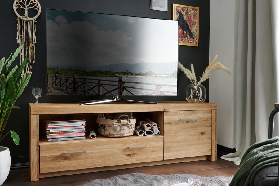 - Proste linie i minimalistyczna stylistka komody rtv otwierają wiele możliwości aranżacyjnych oraz eksponują największe walory litego dębu.