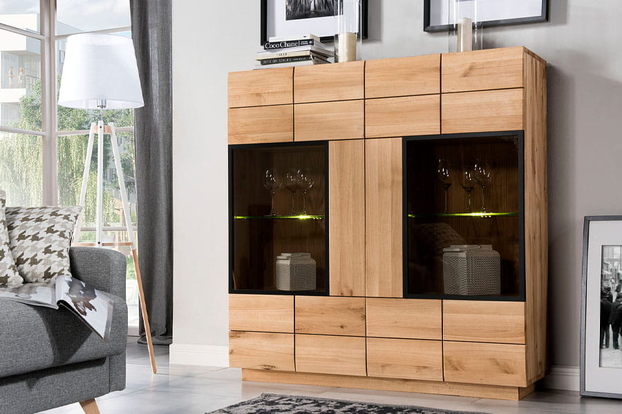 Kolekcja ta jest wykonana z dębu starego, gdzie nieprzewidywalny rysunek drewna zamknęliśmy w geometrycznych formach. Surowa i jednocześnie nowoczesna linia tej kolekcji podkreślona ciemnymi ramkami szkła i subtelnym oświetleniem zachwyca i pozwala na odnalezienie spokoju i równowagi.