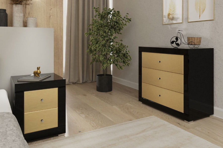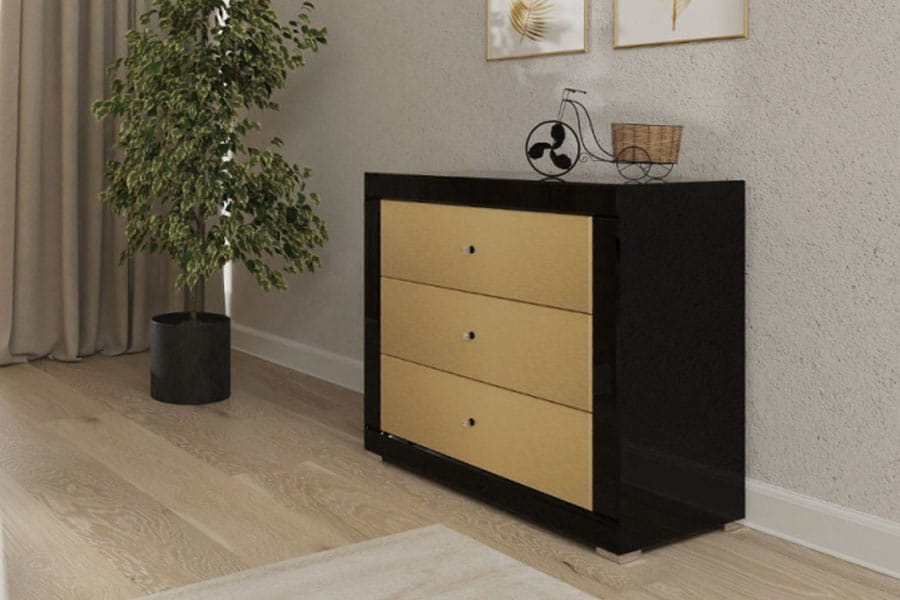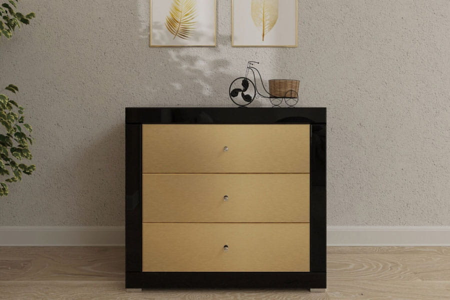 Nasza kolekcja lustrzanych komód z błyszczącymi frontami to jedyna taka oferta mebli w Europie! Lustrzana komoda Golden B3 jest połączeniem wysokiej jakości fazowanego szkła w czarnym kolorze z frontami w złotym odcieniu, które wykonaliśmy z płyty z kolekcji firmy Kronospan AL04 Brushed Gold. Każdą szufladę wyposażyliśmy w niezawodne prowadnice Axis Pro z funkcją miękkiego domyku. Dzięki temu otwiera się lekko i łatwo, a zamyka bez ryzyka przytrzaśnięcia palców. Czarne kryształowe uchwyty dodają jej charakteru. Dzięki eleganckiemu wykończeniu nasza komoda świetnie się sprawdzi jako piękna dekoracja aranżacji w stylu glamour i nowoczesnych. A 3 głębokie i pakowne szuflady sprawiają, że będzie też meblem bardzo funkcjonalnym i oferującym mnóstwo miejsca do przechowywania. Komoda jest robiona ręcznie i w 100% w Polsce. Możesz ją kupić w szerokości od 60 do 120 cm, dopasujesz ją więc wielkością do Twojego wnętrza. Komoda jest przy tym wysoka na 74 cm i głęboka na 40 cm