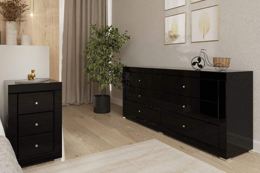 Lustrzana komoda z 4 szufladami wykonana jest z wysokiej jakości czarnego szkła fazowanego. Będzie elegancką i stonowaną propozycją do nowoczesnej sypialni, salonu w stylu glamour czy stylowego przedpokoju. Głęboki czarny kolor wprowadza powiew luksusu i dodaje charakteru wnętrzu. Komoda ma 4 wygodne i pojemne szuflady, z których każda wykończona jest ozdobną kryształową gałką. Wyposażyliśmy je w praktyczną funkcję pełnego wysuwu, pomagającą otworzyć je łatwo i bez problemu. Przydatną innowacją jest również funkcja miękkiego domyku, dzięki której szuflady domkną się bezszelestnie i bez ryzyka przytrzaśnięcia palców. Nasz komoda czarne szkło na 4 szuflady wykonana jest w całości ręcznie i z materiałów bardzo wysokiej jakości. To mebel, który od początku do końca powstaje w Polsce. Będzie piękną ozdobą każdego wnętrza, a jej uroda rozjaśni każdą, nawet najmniejszą przestrzeń.