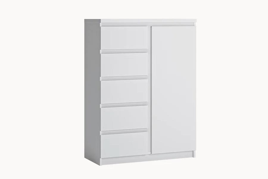 Wysoka komoda z szufladami zajmuje mało miejsca, a mimo to jest pojemna - idealny mebel do małych wnętrz. Do dyspozycji jest aż pięć szuflad oraz trzy przestrzenie ukryte za frontem. Biała komoda została wyposażona w praktyczne akcesoria meblowe w postaci szuflad z pełnym wysuwem, a także wygodny w użytkowaniu system bezuchwytowy. Komoda z kolekcji Fribo zasługuje na uznanie ze względu na prostą formę i funkcjonalność, biel dekoru może być bazą do licznych kolorystycznych aranżacji. Mebel wykonany jest z płyty wiórowej laminowanej odpornej na wilgoć, zarysowania, uszkodzenia i wysoką temperaturę. Program występuje w dwóch odsłonach kolorystycznych: Biel Alpejska i Dąb Ribbeck.