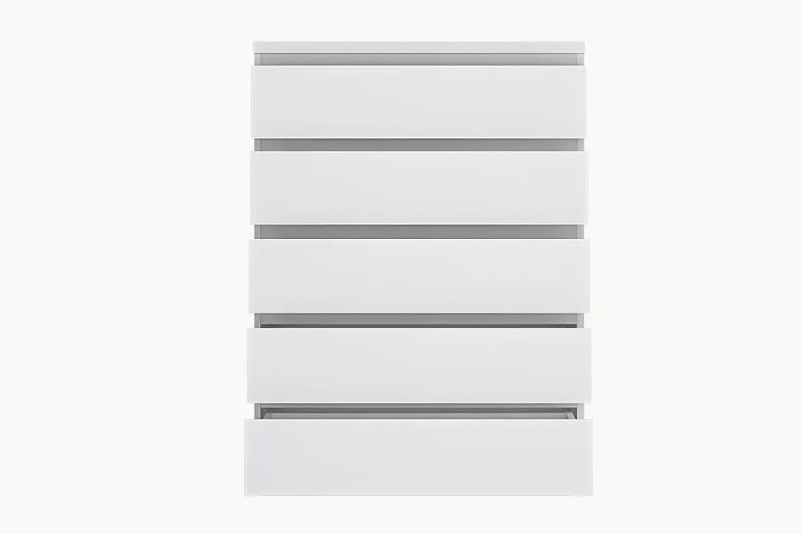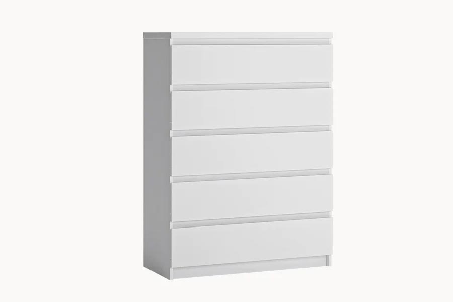 Jesteś osobą wymagającą, dla której liczą się jakość i doskonały design mebli? Mamy coś dla Ciebie. Kolekcja Fribo białe, w ramach której prezentujemy komodę z pięcioma szufladami wyróżnia się nowoczesnym efektem wizualnym, wysoką funkcjonalnością oraz trwałością. Wykonana z płyty laminowanej w kolorze białym komoda o minimalistycznym wyglądzie znakomicie sprawdzi się w nowocześnie urządzonej sypialni jako dopełnienie wystroju, złożonego z mebli Fribo białe. Biała komoda z szufladami jest meblem, w którym zmieścisz bieliznę, paski, apaszki oraz kosmetyki. Dzięki funkcjonalnym wymiarom mebel zmieści się nawet w niedużej sypialni.