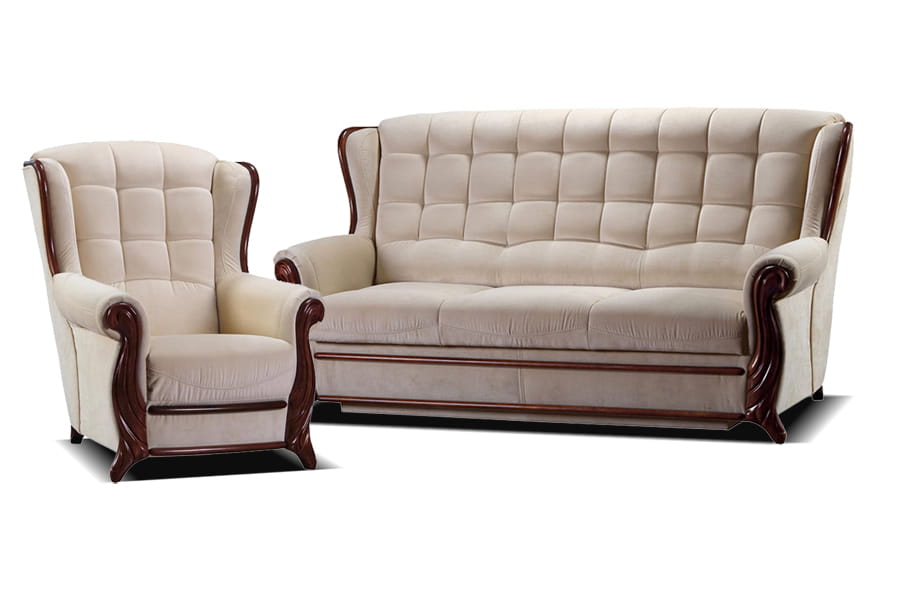 W zestawie wypoczynkowym La Viano zawierają się wersalka oraz dwa fotele, dla których wspólną cechą są prosty, nowoczesny kształt oraz eleganckie pikowania na oparciu nadające niebywałej estetyki i reprezentacyjnego charakteru. Meble stoją na wysokich, drewnianych nóżkach, które pięknie komponują się z całością, tworząc efektowny zestaw do modnie zaaranżowanego pokoju dziennego. Wyposażenie wersalki w funkcję spania ( stelaż belgijski ) bez pojemnika na pościel idealnie sprawdzi się podczas wizyty gości.