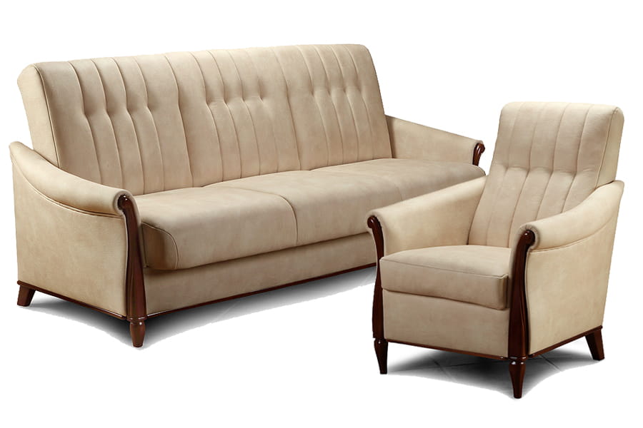 Zestaw wypoczynkowy Michael to wersalka oraz dwa fotele, które stanowią doskonałą propozycję do aranżacji kącika wypoczynkowego mieszkania. Klasyczna linia, zaokrąglone podłokietniki, dobrze wyprofilowane oparcia oraz eleganckie, drewniane nóżki to cechy wyróżniające meble z tego kompletu. Wersalka z funkcją spania i pojemnikiem na pościel świetnie sprawdzi się podczas wizyty gości, tworząc dla nich komfortowe miejsce do noclegu.