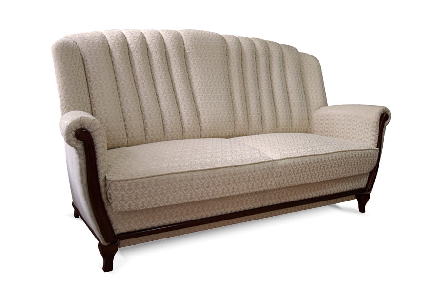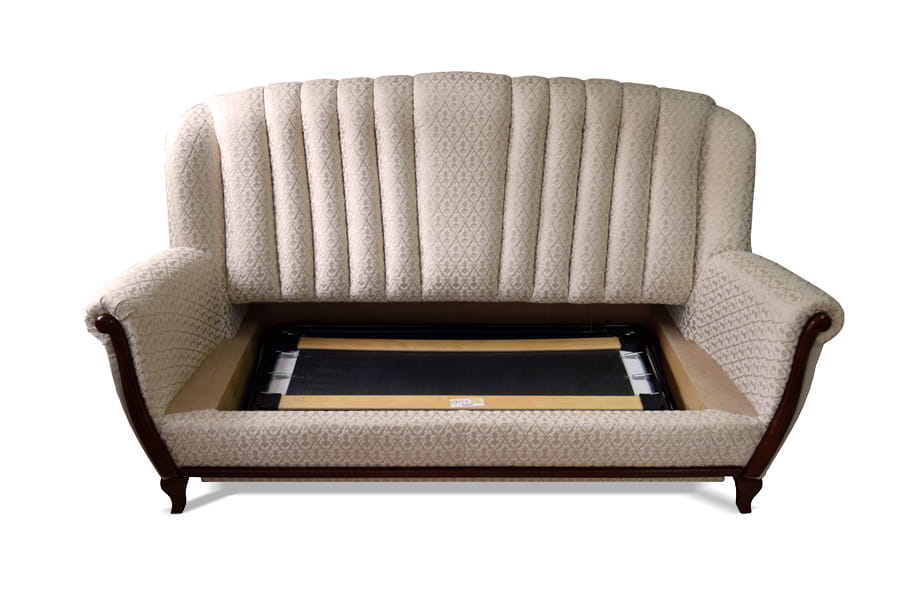 - sofa 3-osobowa z funkcją spania ( stelaż belgijski rozkładaniem przypomina system stosowany w łóżkach polowych. Mechanizm składa się ze specjalnego stelażu oraz rozkładanych nóżek. Aby rozłożyć tego typu sofę czy narożnik, należy wysunąć do góry stelaż ukryty w siedzisku, a następnie “rozwinąć go”, rozkładając przy tym specjalne nóżki, podtrzymujące konstrukcję. Pianka ukryta w sofie z rozkładaniem typu ‘belgijka’ bywa cieńsza od tych użytych przy produkcji innych mebli wypoczynkowych. Stelaż belgijski nie wymaga odsuwania mebla od ściany )