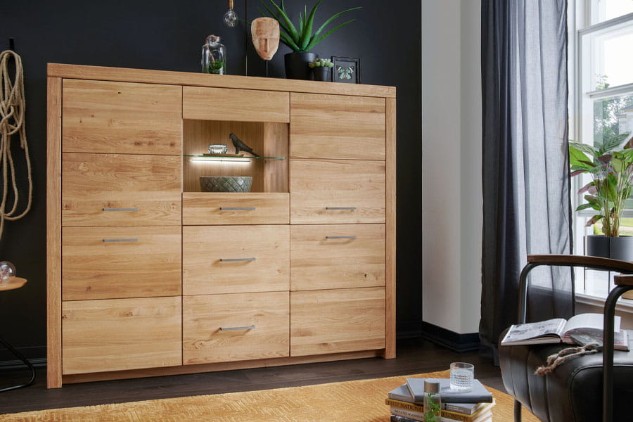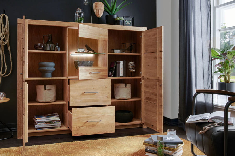 - Proste linie i minimalistyczna stylistka witryny otwierają wiele możliwości aranżacyjnych oraz eksponują największe walory litego dębu.