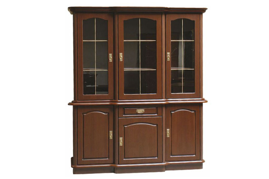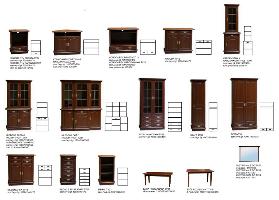 • Nadstawka kredensu (witryna) składa się z części trzydrzwiowej częściowo przeszklonej,  komoda kredensu składa się z części trzydrzwiowej oraz jednej szuflady.