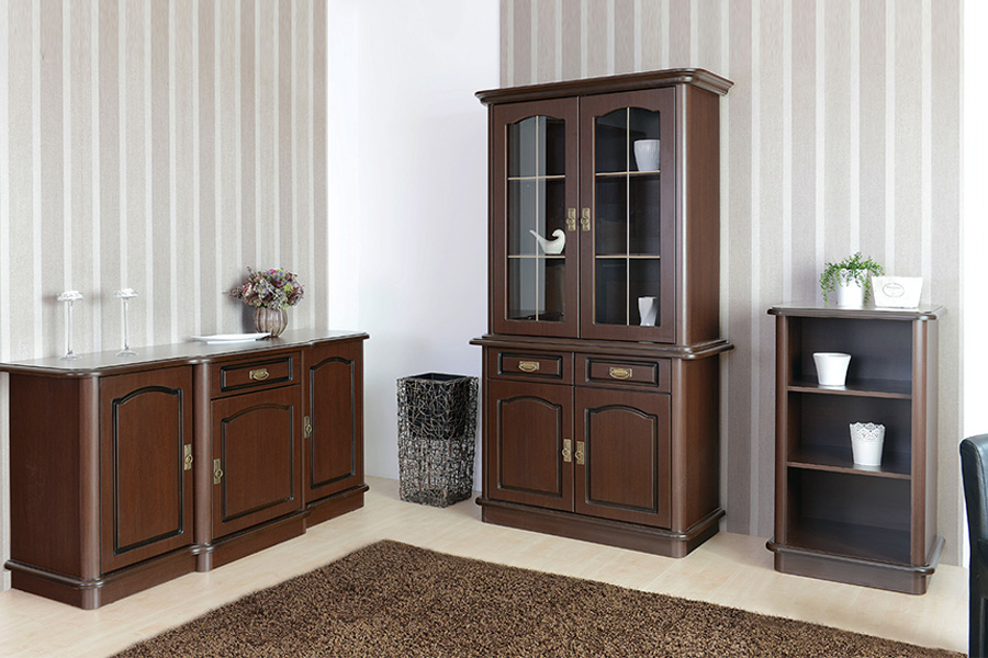 • Klasyczny styl mebli podkreślają ozdobne korony oraz metalowe stylizowane uchwyty.