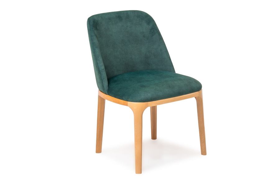 Ma fantastyczny, uniwersalny wzór, dlatego idealnie pasuje do nowoczesnych jadalni. Mebel przyciąga wzrok elementami wykonanymi ze szlachetnego, udekorowanego naturalnym usłojeniem, drewna. Są nimi smukłe nóżki oraz zwieńczenie oparcia, wzbogacone o dodatkowy otwór, który ułatwi jego przenoszenie. Krzesło w zależności od Twoich upodobań, może być pokryte tkaniną lub skórą, które dopełnią jego efektowną formę.
