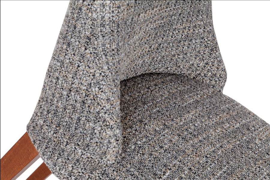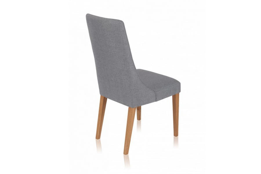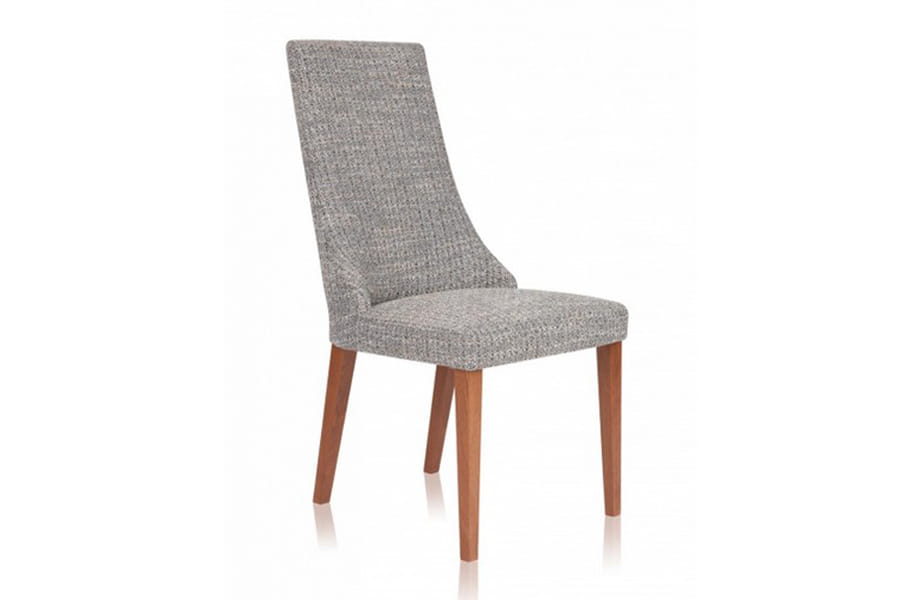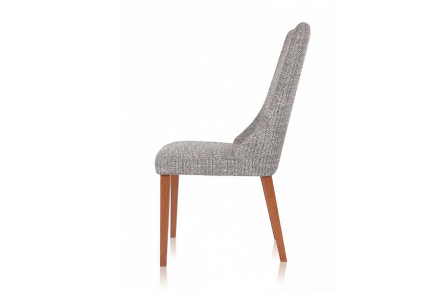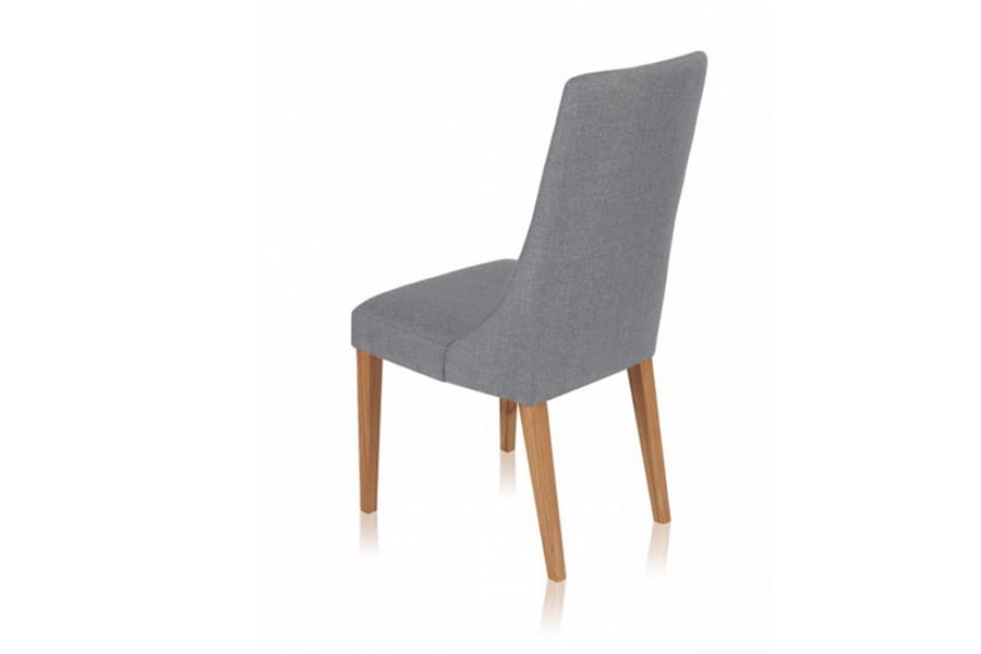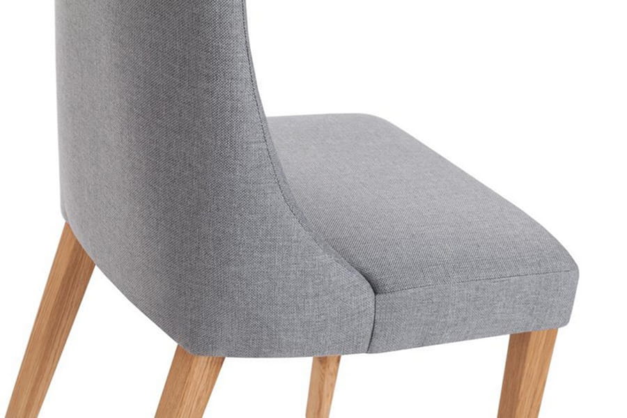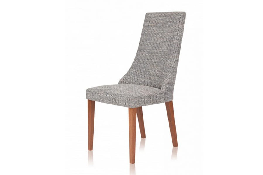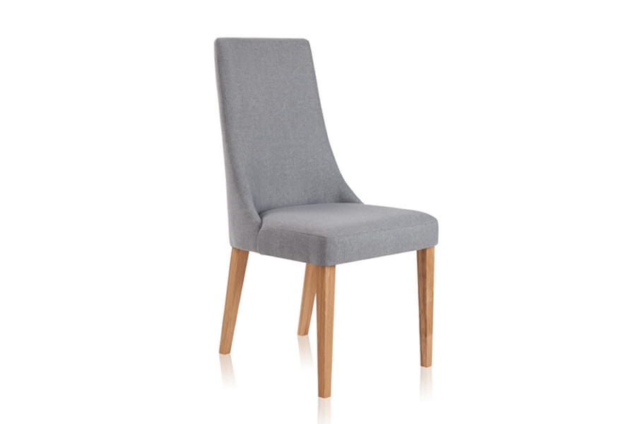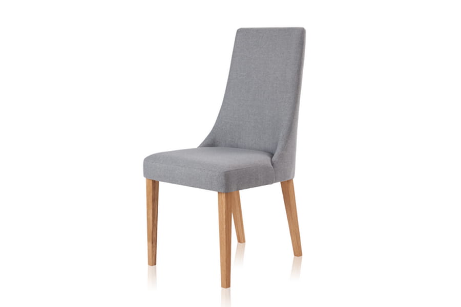 Krzesło tapicerowane Igo wykonane z litego drewna dębowego, dzięki czemu jest trwałe i stabilne. Ciekawie zaprojektowana bryła z wysokim oparciem płynnie przechodzącym w wygodne siedzisko posiada stylowe, długie nóżki. Do wyboru mamy kilka grup tkanin i kilka kolorów drewnianego stelaża. W siedzisku zastosowane są pasy tapicerskie.