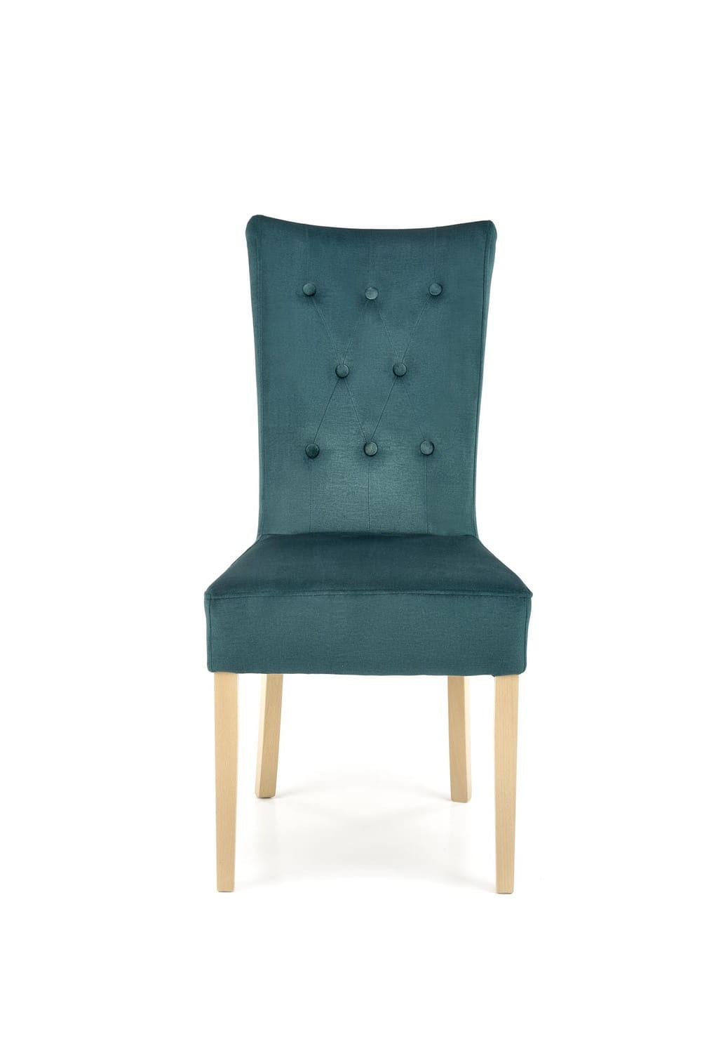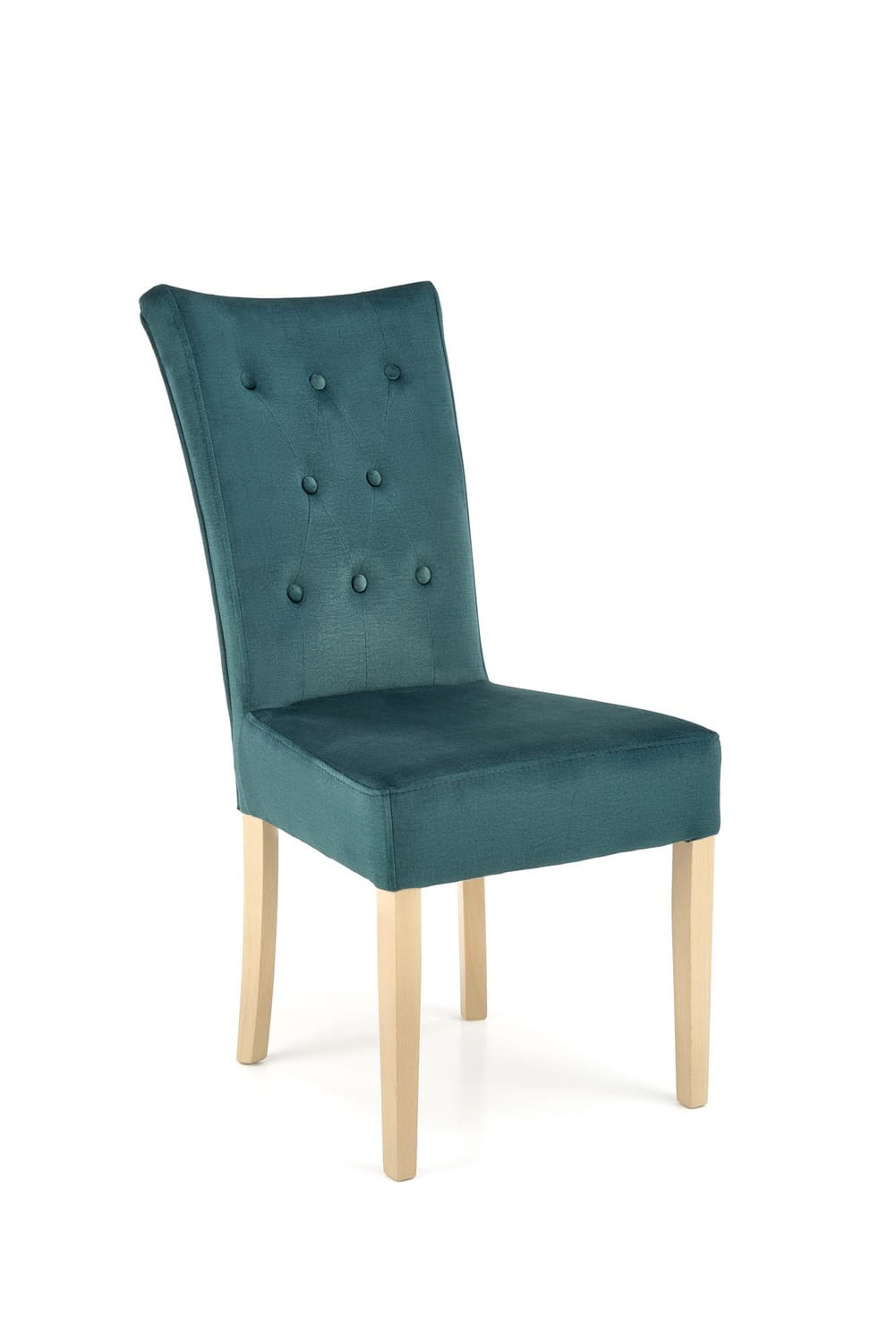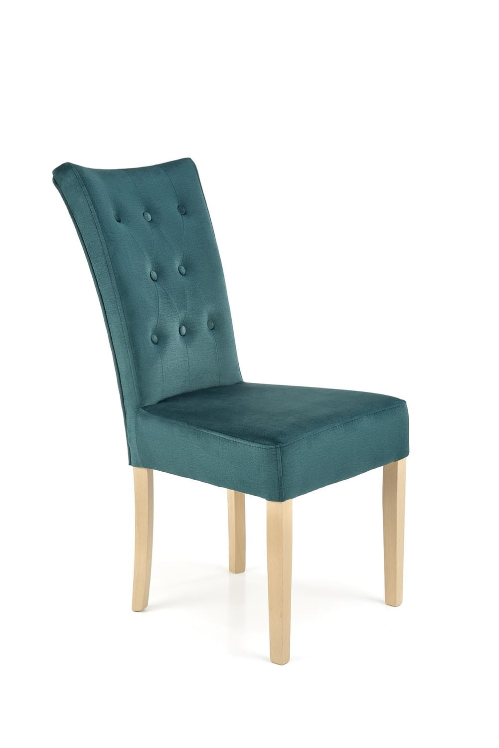 Klasyczne krzesło VERMONT to harmonijne połączenie minimalizmu i elegancji. Jego prostokątne siedzisko doskonale współgra z wysokim oparciem, które delikatnie odchyla się ku tyłowi, nadając mu charakterystyczny wygląd. Wykończenie krzesła welurową, ciemno zieloną tkaniną o lekkim połysku nadaje meblowi atrakcyjny wygląd. Szczególną uwagę zasługuje zdobienie oparcia – eleganckie guziki, które są obciągnięte tą samą tkaniną, co obicie. Ta subtelna, ale wyrazista ozdoba dodaje krzesłu wyjątkowego uroku. Krzesło VERMONT zostało wyposażone w cztery drewniane nogi w kolorze miodowego dębu, które dodają mu naturalnego charakteru i doskonale komponują się z barwą obicia. Uniwersalne i ponadczasowe krzesło VERMONT doskonale wpasowuje się zarówno w klasyczne aranżacje wnętrz, jak i w przestrzenie w stylu skandynawskim. Idealnie pasuje do salonu, jadalni oraz eleganckiej kuchni. Ponadto sprawdzi się również w przestrzeniach komercyjnych, takich jak restauracje, kawiarnie, hotele czy pensjonaty.
