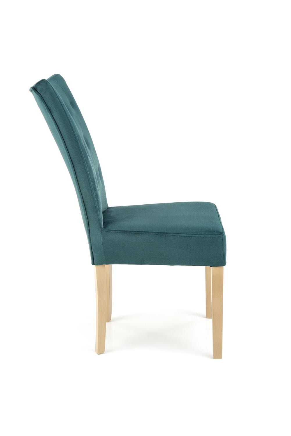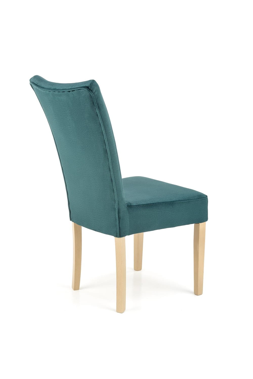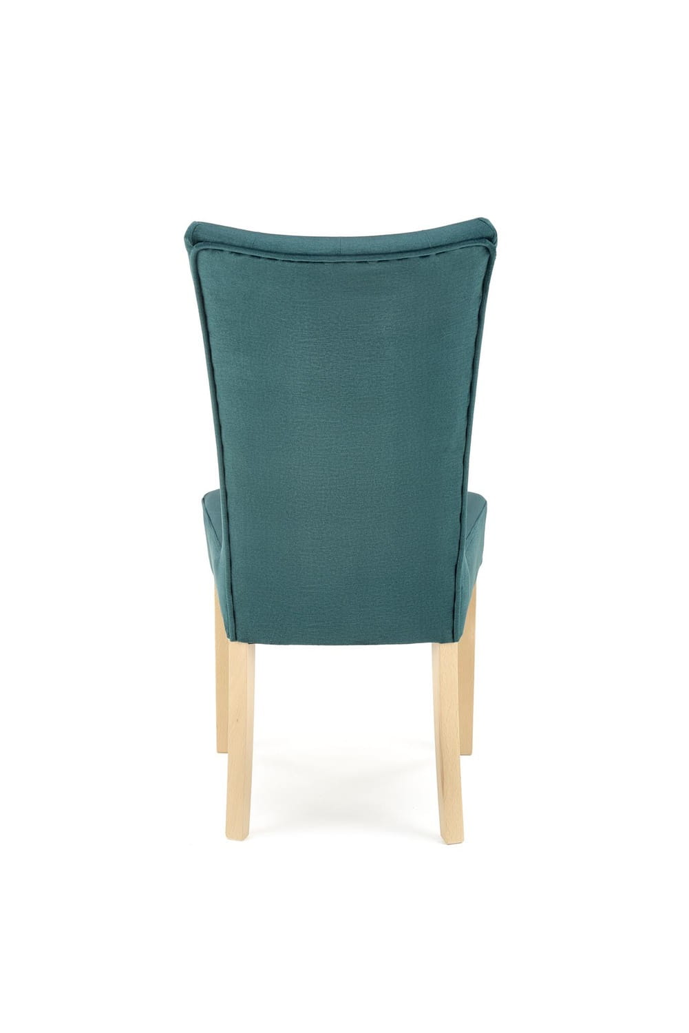 Klasyczne krzesło VERMONT to harmonijne połączenie minimalizmu i elegancji. Jego prostokątne siedzisko doskonale współgra z wysokim oparciem, które delikatnie odchyla się ku tyłowi, nadając mu charakterystyczny wygląd. Wykończenie krzesła welurową, ciemno zieloną tkaniną o lekkim połysku nadaje meblowi atrakcyjny wygląd. Szczególną uwagę zasługuje zdobienie oparcia – eleganckie guziki, które są obciągnięte tą samą tkaniną, co obicie. Ta subtelna, ale wyrazista ozdoba dodaje krzesłu wyjątkowego uroku. Krzesło VERMONT zostało wyposażone w cztery drewniane nogi w kolorze miodowego dębu, które dodają mu naturalnego charakteru i doskonale komponują się z barwą obicia. Uniwersalne i ponadczasowe krzesło VERMONT doskonale wpasowuje się zarówno w klasyczne aranżacje wnętrz, jak i w przestrzenie w stylu skandynawskim. Idealnie pasuje do salonu, jadalni oraz eleganckiej kuchni. Ponadto sprawdzi się również w przestrzeniach komercyjnych, takich jak restauracje, kawiarnie, hotele czy pensjonaty.