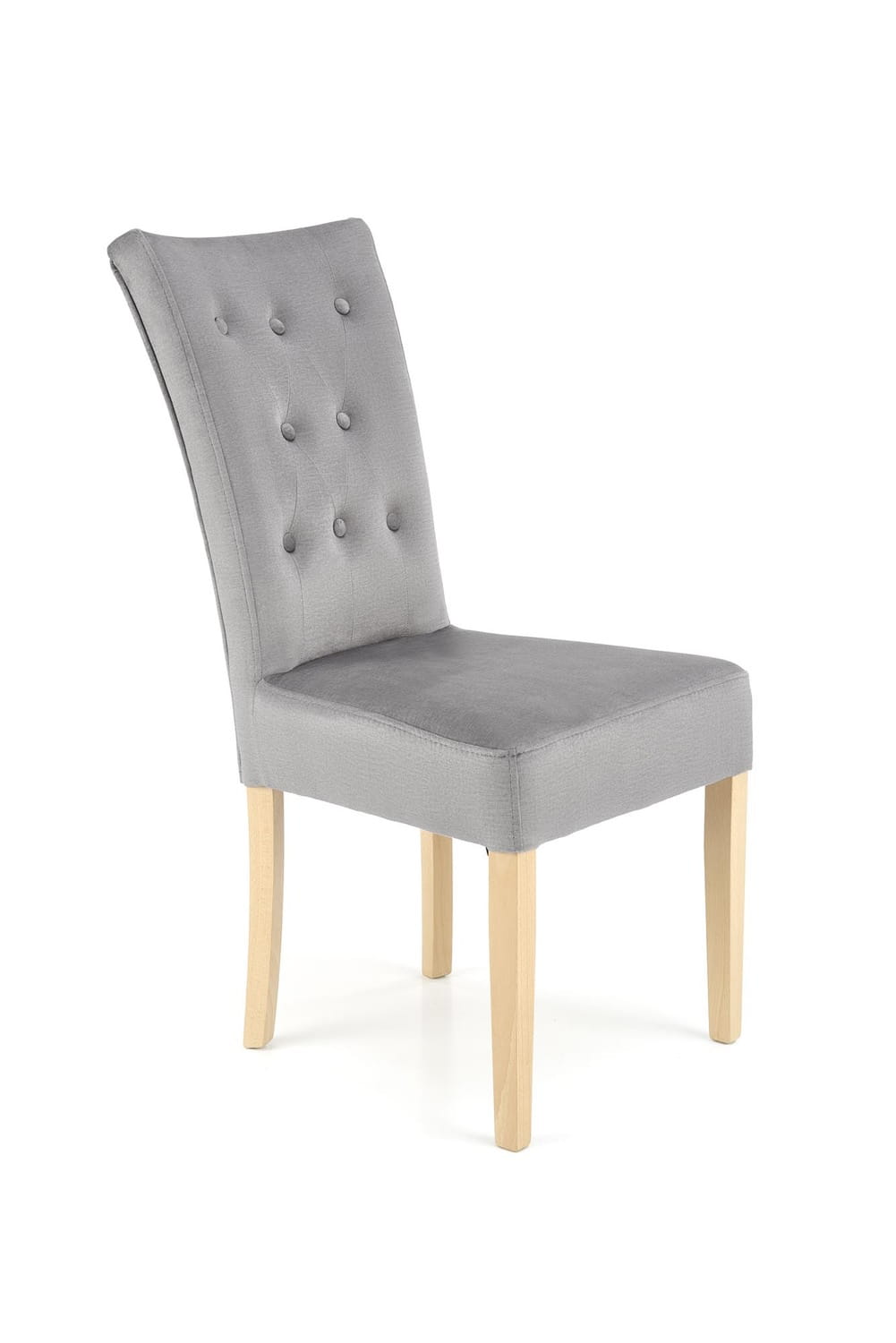 Klasyczne krzesło VERMONT to harmonijne połączenie minimalizmu i elegancji. Jego prostokątne siedzisko doskonale współgra z wysokim oparciem, które delikatnie odchyla się ku tyłowi, nadając mu charakterystyczny wygląd. Wykończenie krzesła welurową, popielatą tkaniną o lekkim połysku nadaje meblowi atrakcyjny wygląd. Szczególną uwagę zasługuje zdobienie oparcia – eleganckie guziki, które są obciągnięte tą samą tkaniną, co obicie. Ta subtelna, ale wyrazista ozdoba dodaje krzesłu wyjątkowego uroku. Krzesło VERMONT zostało wyposażone w cztery drewniane nogi w kolorze miodowego dębu, które dodają mu naturalnego charakteru i doskonale komponują się z barwą obicia. Uniwersalne i ponadczasowe krzesło VERMONT doskonale wpasowuje się zarówno w klasyczne aranżacje wnętrz, jak i w przestrzenie w stylu skandynawskim. Idealnie pasuje do salonu, jadalni oraz eleganckiej kuchni. Ponadto sprawdzi się również w przestrzeniach komercyjnych, takich jak restauracje, kawiarnie, hotele czy pensjonaty.