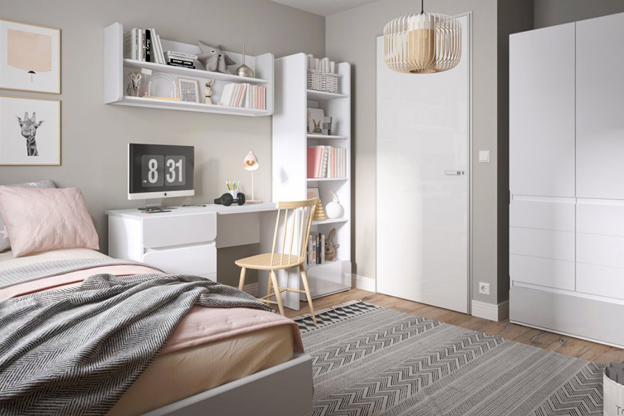 Flexi to młodzieżowy zestaw mebli o wszechstronnym designie, który równie dobrze sprawdzi się w pokoju dziecięcym. Subtelne kontrasty dekorów oraz poziome frezowania na frontach tworzą oryginalne kompozycje, podkreślając estetyczny charakter mebli. Dodatkowym atutem są zaokrąglone fronty i korpusy, które nadają kolekcji lekkości oraz zapewniają komfort użytkowania. Program Flexi, pozbawiony uchwytów, podkreśla swoją nowoczesność i praktyczność, oferując funkcjonalne rozwiązania w stylowym wydaniu.