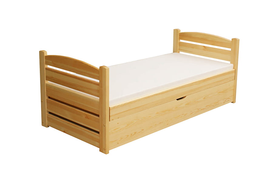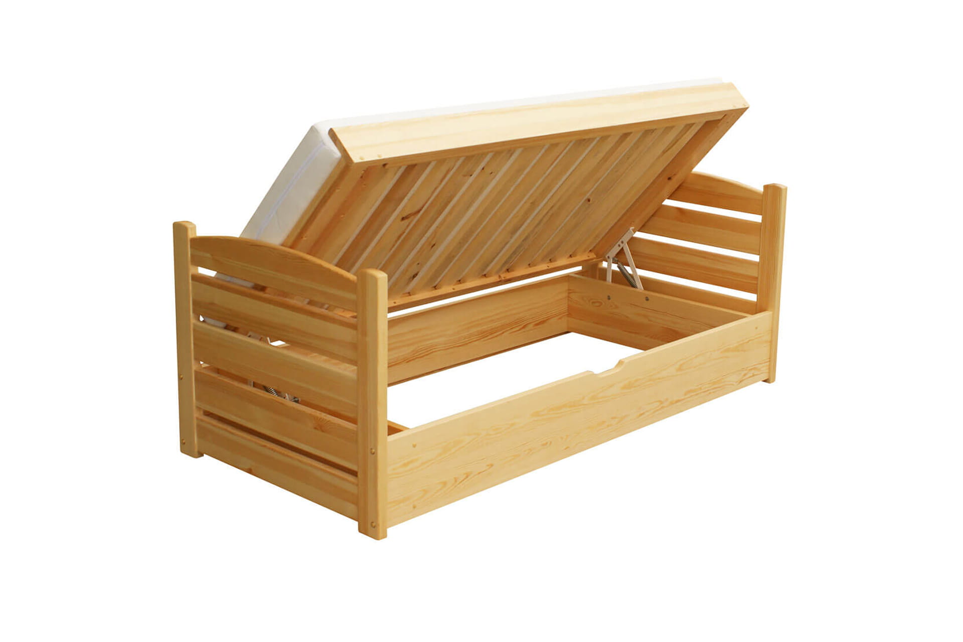 Łóżko BŁAŻEJ zostało wykonane z litego drewna sosnowego, które cechuje się naturalnymi właściwościami konstrukcyjnymi oraz ekologicznymi. Podnoszony materac na stelażu jest jednocześnie wiekiem przestrzeni do przechowywania. Z łatwością pomieści dodatkową parę pościeli, kołder, prześcieradeł i poduszek. Gwarancję wieloletniego użytkowania zapewnia solidna i trwała konstrukcja.