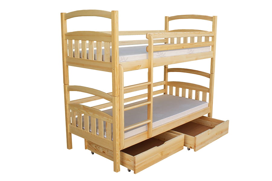 Łóżko HERMAN II zostało wykonane z litego drewna sosnowego, które cechuje się naturalnymi właściwościami konstrukcyjnymi oraz ekologicznymi. Łóżko piętrowe HERMAN II idealnie sprawdzi się w pokoju dzieci i młodzieży, a także w pensjonatach, ośrodkach wczasowych i wszędzie tam, gdzie wymagana jest większa ilość miejsc sypialnianych, a przestrzeń jest ograniczona. Dodatkowe szuflady pod łóżkiem pozwalają przechowywać dodatkową parę kołder, pościeli, prześcieradeł i poduszek. Gwarancję wieloletniego użytkowania zapewnia solidna i trwała konstrukcja.